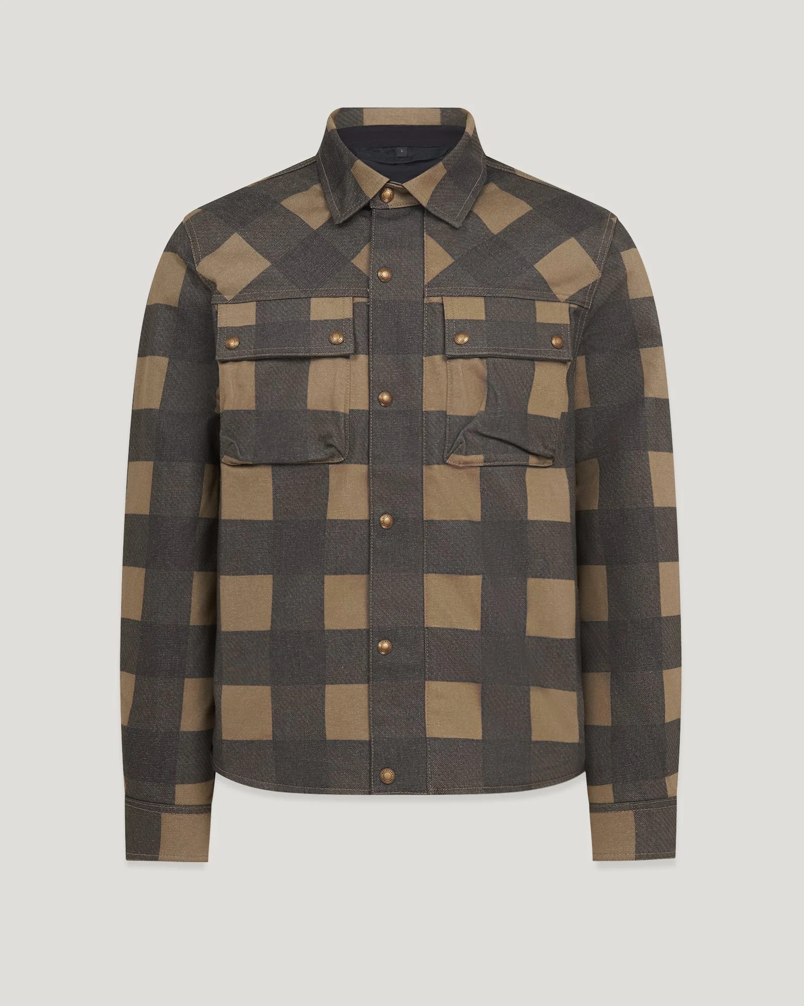 In Belstaff Olive and Black check, our Mansion motorcycle overshirt is made from Cordura stretch denim and combines style with protection. D3O shoulder and elbow armour come as standard, as does an internal pocket for optional back protection. Twin needle topstitching and reinforced pockets deliver strength and durability. The shaped hem covers the lower back with added protection from the high-tenacity canvas shell. Hidden collar snaps prevent flapping while the classic check lining, sleeve patch and heritage chest label add the finishing details. DETAILS - Inside pocket with zip - Twin needle topstitching for strength - Belstaff signature check lining - Shaped lower hem to cover the lower back - High-tenacity canvas shell - Hidden collar snaps to prevent flapping on bike - Belstaff sleeve patch and heritage chest label - Zipped back protector pocket (Viper recommended) - Armour pockets reinforced with tape - Two stud closure chest pockets - Stud closure cuffs - Two zip entry side pockets - Shell: 47% Cotton, 20% Nylon, 16% Polyamide, 16% Polyester, 1% Elastane. Body Lining: 100% Polyester. Sleeve Lining: 100% Polyamide - Certification: AA - Protection: D3O Tri-ventilation level 1 (Elbow/Shoulder) - Product ref: 105581BFOBK SIZE AND FIT - Cut for a regular fit