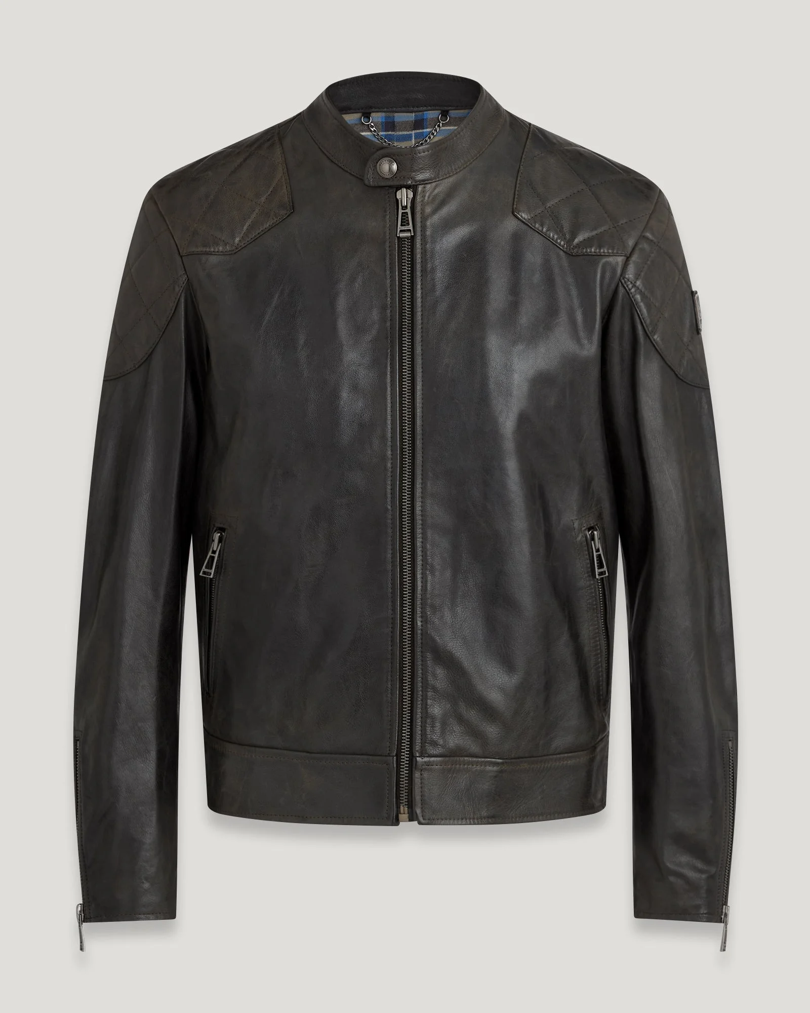 The Outlaw in black is always on our most-wanted list. Following its landmark introduction in 2015, this men's cafe-racer became an instant Belstaff classic. This update refines rather than reinvents, with an exclusive artisanal finish applied to the hand-waxed leather for a unique character. DETAILS - Hand waxed leather with a patina that will darken with age - Durable, water-repellent coating - Our signature check cotton twill lining - CafA© racer style collar with press stud closure - Metal plaque on leather base on left sleeve - Centre front zip closure with snap closure collar - Two lower zipped pockets - Belstaff`s leather products support responsible manufacturing via the Leather Working Group. - Shell: 100% Cow Leather, Body Lining: 100% Cotton, Sleeve Lining: 100% Viscose/Rayon - Product ref: 105313BLACK SIZE AND FIT - Cut for a slim fit - Model wears a size US 40 - Model measures: Height: 6'1", Chest: 36", Waist: 31"