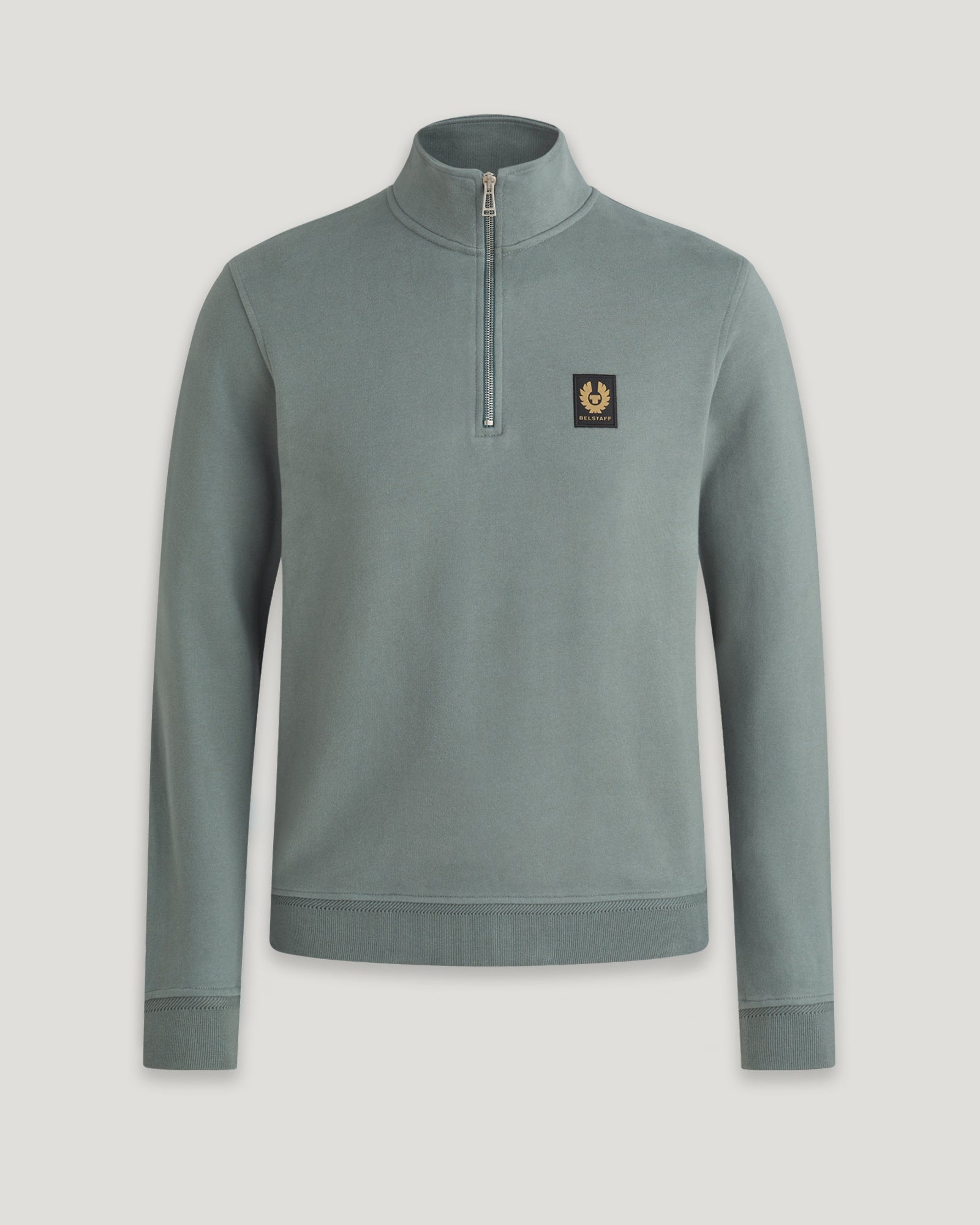 The Belstaff Quarter Zip Sweatshirt in Mineral Green. A pared-back sweatshirt with a high zip collar and our badge of honour on the chest. DETAILS - Signature Belstaff fleece cotton - Long sleeve sweatshirt with a quarter zip - Ribbed collar and cuffs - Belstaff phoenix patch on left chest - Quarter zip front closure - By choosing our cotton products, you’re supporting Belstaff`s investment in Better Cotton’s mission. This product is sourced via a system of mass balance and therefore may not contain Better Cotton. Learn more at bettercotton.org/learnmore - Body: 100% Cotton - Rib: 98% Cotton, 2% Elastane - Product ref: 103001MRLGN SIZE AND FIT - Cut for a regular fit - Model wears a size M - Model measures: Height: 6'0", Chest: 40", Waist: 31"