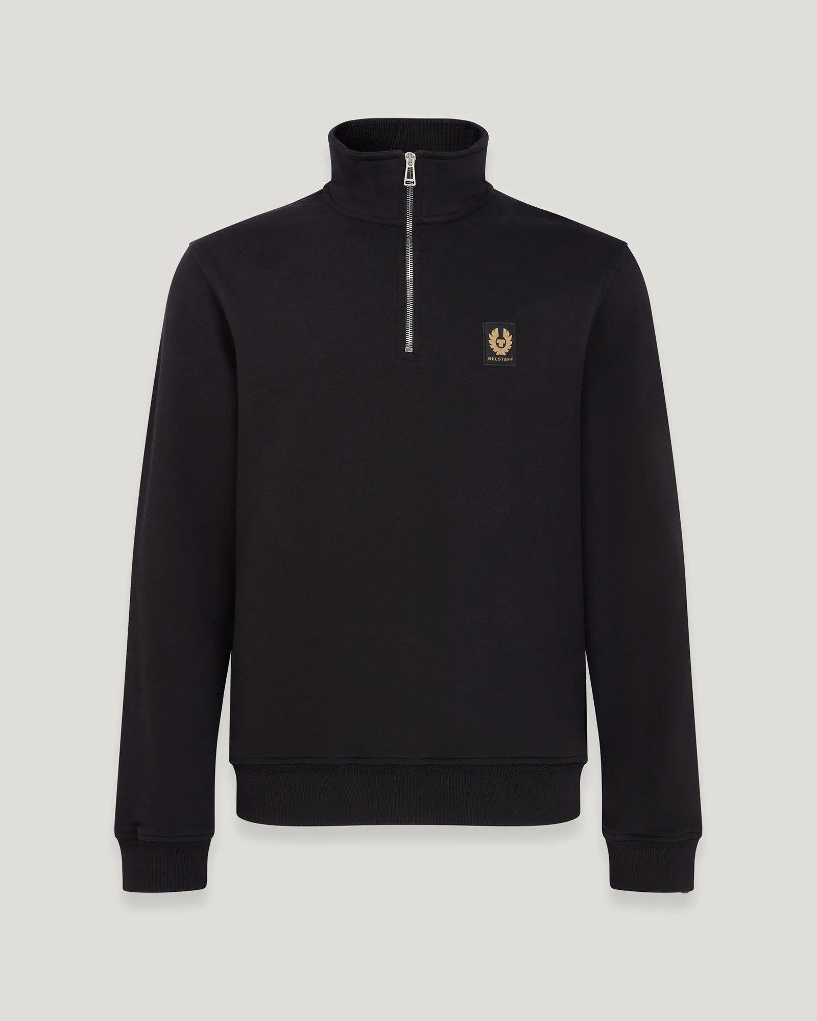 The Belstaff Quarter Zip. A simple sweatshirt with a high zip collar and our badge of honour on the chest. DETAILS - Cotton fleece - Long-sleeved sweatshirt with zipped stand collar - Ribbed collar and cuffs - Zip neck closure - Phoenix logo patch on the chest - 100% loopback cotton - Product ref: 103001BLACK SIZE AND FIT - Cut for a relaxed fit - Model wears a size L - Model measures: Height: 6'1", Chest: 39", Waist: 31"