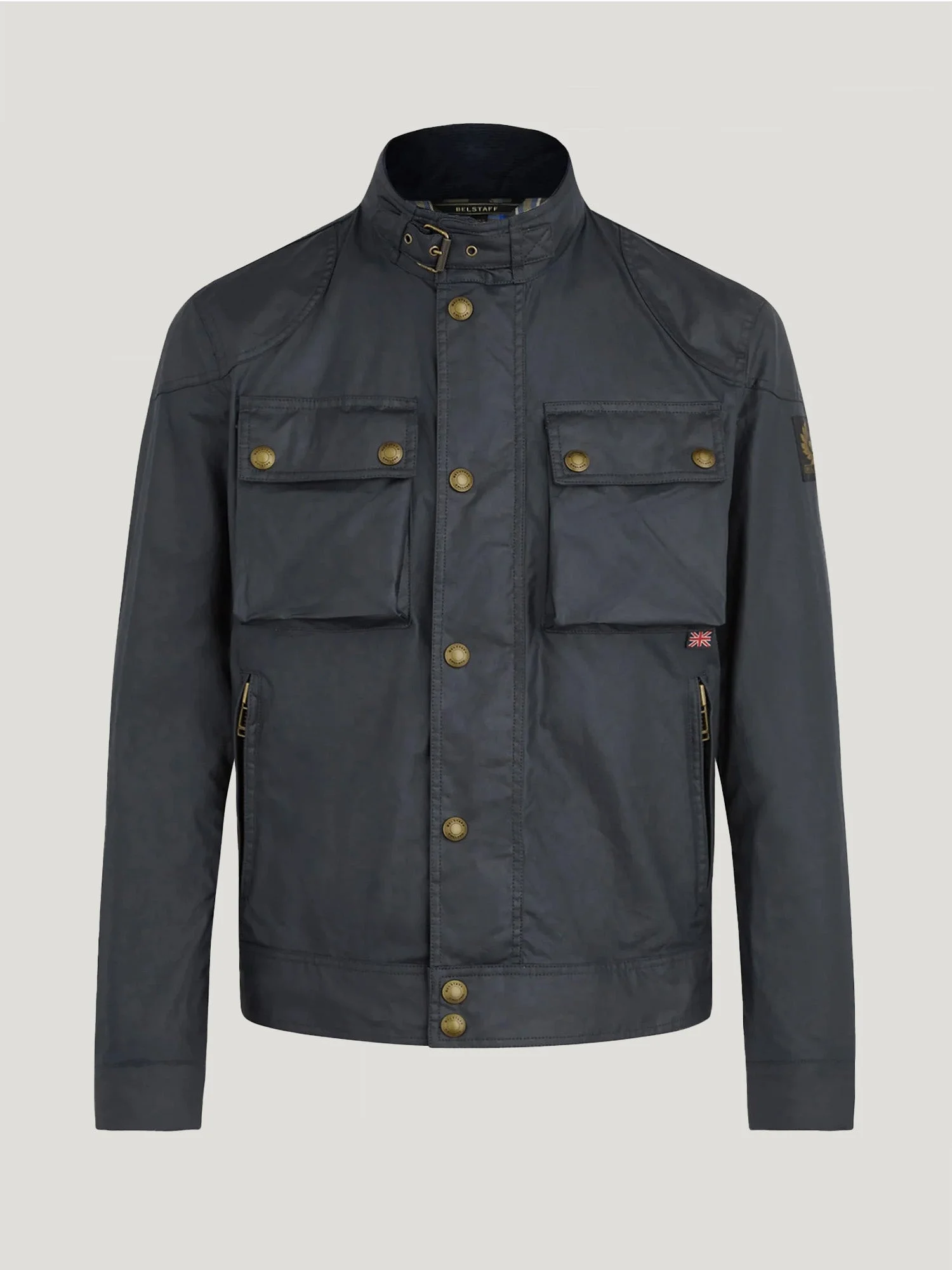 The Racemaster jacket in Dark Navy. There’s more to the Racemaster than meets the eye. Introduced back in 1981, it was originally billed as a shorter version of the iconic Trialmaster. This means that, along with the history, heritage, and dark navy 6 oz. waxed cotton, you also get increased mobility and freedom to move. DETAILS - 6 oz. waxed cotton, with a unique blend of micro and technical waxes - Four external pocket field jacket with reinforcement patches and corduroy details - Water-repellent and wind-repellent - Corduroy linings at the collar, cuffs and hem providing added comfort and resilience at high contact points - Signature antique brass metal hardware with Belstaff England engraved on the round and signature phoenix woven patch on left sleeve - Centre front zip closure with snap closure placket - Buckle-adjusted collar - Two press-stud flap pockets - Two lower zipped pockets - Left internal pocket - By choosing our cotton products, youare supporting Belstaff`s investment in Better Cottonas mission. This product is sourced via a system of mass balance and therefore may not contain Better Cotton. Learn more at bettercotton.org/learnmore - Shell: 100% Cotton, Body Lining: 100% Cotton - Sleeve Lining: 55% Polyester, 45% Viscose/Rayon - Product ref: 105306DKNVY SIZE AND FIT - Cut for a slim fit - Model wears a size US 40 - Model measures: Height: 6'1", Chest: 39a, Waist: 30"