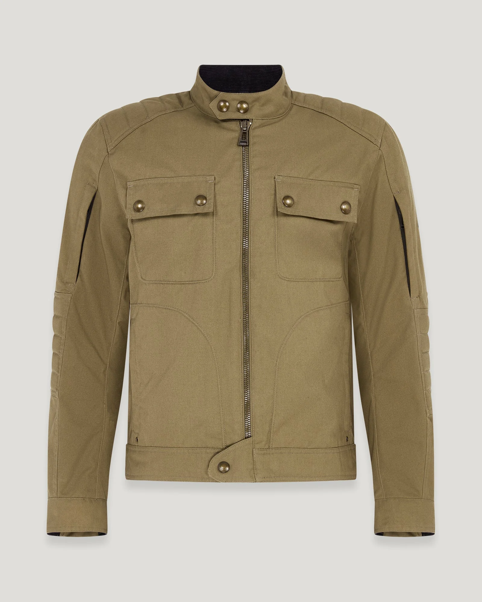 Made from technical cotton canvas with a breathable, waterproof membrane, the Roberts motorcycle jacket features D3O shoulder and elbow armour and an internal pocket for optional back protection. Available in Black or Belstaff Olive with lower zipped pockets and an internal zipped pocket for valuables, the oil-resistant corduroy collar and cuffs are hard-wearing with side adjusters. Underarm vents and a zip shield with guttering help repel the rain. The design is finished with a check cotton lining, antique brass fastenings, a logo arm patch and a heritage chest label. DETAILS - Breathable, waterproof membrane - Zipped pocket for back protector - Lower zipped pockets - Belstaff signature check lining - Soft oil resistant corduroy on neck collar and cuffs - Side latch for size adjustment - Engraved antique brass fastenings - Belstaff sleeve patch and heritage chest label - Under-arm metal airvents - Zip shield with rain gutter - 15cm inside zip pocket for valuables - Silicone last central snap to protect the tank - Belstaff checked woven cotton liningA - Signature woven logo patch on left arm - Stud fastening internal trouser loops - Shell: 65% Polyester, 35% Cotton. Lining: 100% Nylon - Certification: A - Protection: D3O Tri-ventilation level 1 (Elbow/Shoulder) - Product ref: 105580BFOLV SIZE AND FIT - Cut for a regular fit - Model wears a size L - Model measures: Height: 6'2", Chest: 37", Waist: 32"