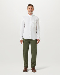With structured garment-dyed linen, the Scale shirt in white offers a smart-casual style that is lightweight and ideal for spring and summer seasons. DETAILS - Garment-dyed linen - Signature tilted chest pocket with button flap - Point collar - Adjustable button cuff - Belstaff phoenix patch on left sleeve - Button front closure - Tilted, bellows pocket with concealed button flap - Product ref: 8b017858-a380-4b5c-a9ec-3b1812faba40 SIZE AND FIT - Cut for a regular fit