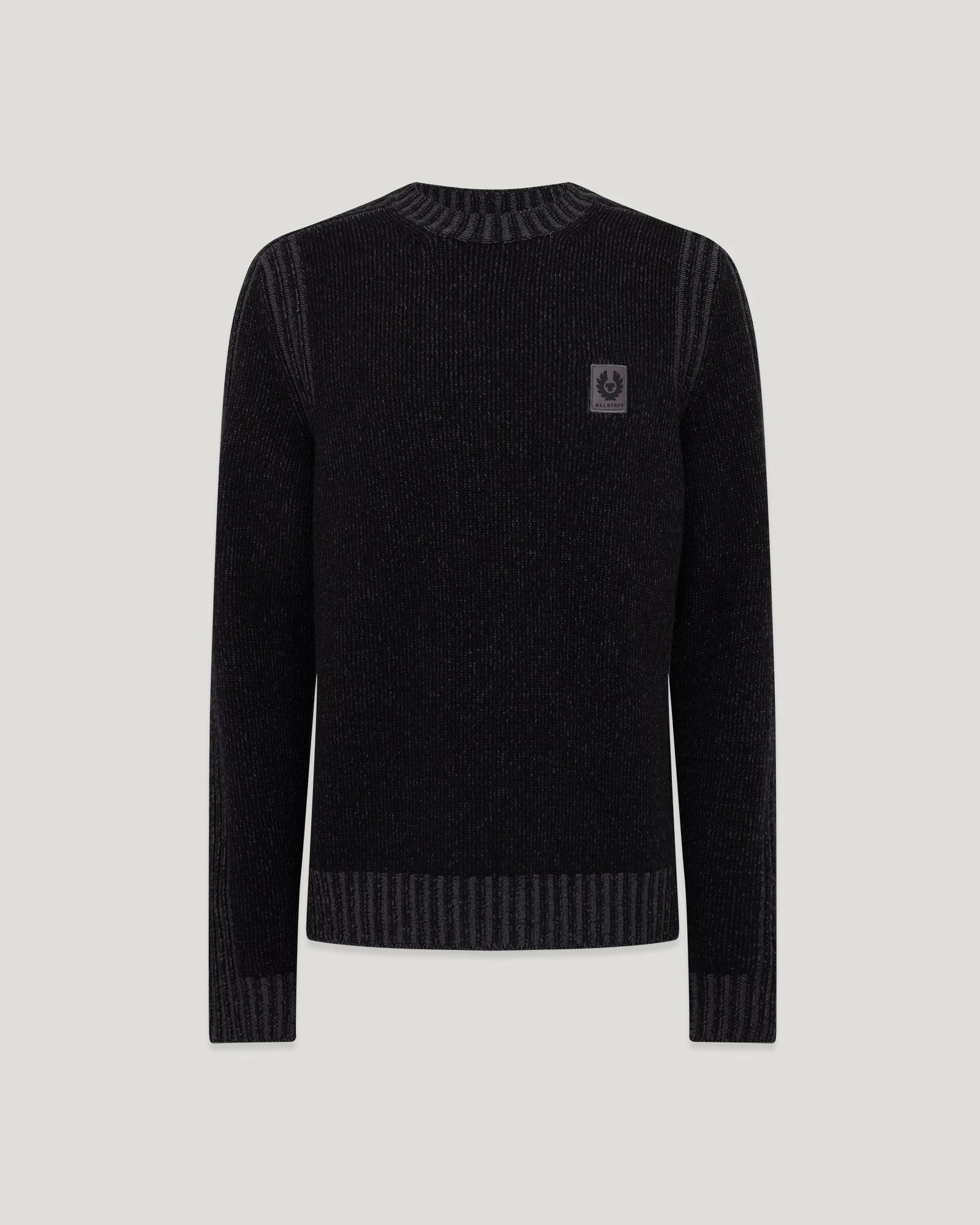 Our Watch crew neck jumper is one people love to come back to again and again. A classic knit sweater finished with our Phoenix. This straightforward Black / Tornado Grey men’s knit is a staple for the season. DETAILS - 5-gauge lambswool - Ribbed collar, cuffs and hem - Engineered rib detailing at sleeve and armhole - Bi-colour plated for two tone effect - Tonal Belstaff phoenix patch on left chest - RWS wool from a responsible source - Body: 100% Extrafine merino wool - Product ref: Grey106028BKTOG SIZE AND FIT - Cut for a regular fit - Model wears a size M - Model measures: Height: 6'1", Chest: 39”, Waist: 30"