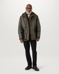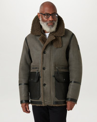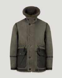 The Snowfield coat takes its vintage look from classic military styles. Tornado Grey / Major Brown premium buffed shearling and brass-tone hardware complements it. This enduring piece is based on our Wilder jacket but with a longer length and its colours are inspired by the archival Belstsaff flight suit. DETAILS - Premium buffed shearling - Sanded finish gives light and darker skin look - Based on Wilder fit with longer length - Colourway inspired by archival Belstaff flight suit - Detachable shearling throat latch with button fastening - Two applied waxy leather hip pockets with side entry and flap and snap - Two zip hip pockets - Authentic multi eyelet underarm detail - Centre front zip with buttoned closure placket - Belstaff's leather products support responsible manufacturing via the Leather Working Group - Body: 100% Dyed lambskin, Trims: Cow leather - Product ref: 105839TOGMB SIZE AND FIT - Cut for a relaxed fit - Model wears a size M - Model measures: Height: 5'11", Chest: 42", Waist: 32"