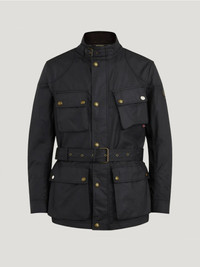 Our definitive jacket since 1948, the Trialmaster's roots are in the Scottish Six Days Trial, originally developed to keep riders dry in tough weather conditions. Built to last from our black 6 oz. waxed cotton, it features a legacy slanted map pocket and adjustable belt so you can perfect the fit. Re-wax to keep it water and wind-repellent. It snaps into the Icon Gilet (sold separately). DETAILS - 6 oz. waxed cotton, with a unique blend of micro and technical waxes - Water-repellent and wind-repellent - Cotton twill lining woven in the signature Belstaff checked pattern - Corduroy linings at the collar, cuffs and hem provide added comfort and resilience at high contact points - Belstaff phoenix patch on left sleeve - Centre front zip and snap placket - Buckle-adjusted collar - Four modern, storm proof bellows pockets with dual press stud closure - Signature tilted left chest pocket - By choosing our cotton products, youare supporting Belstaff`s investment in Better Cottonas mission. This product is sourced via a system of mass balance and therefore may not contain Better Cotton. Learn more at bettercotton.org/learnmore - Shell: 100% Cotton, Body Lining: 100% Cotton - Sleeve Lining: 55% Polyester, 45% Viscose/Rayon - Product ref: 105310BLACK SIZE AND FIT - Cut for a regular fit - Model wears a size US 40 - Model measures: Height: 6'3", Chest: 37", Waist: 32"