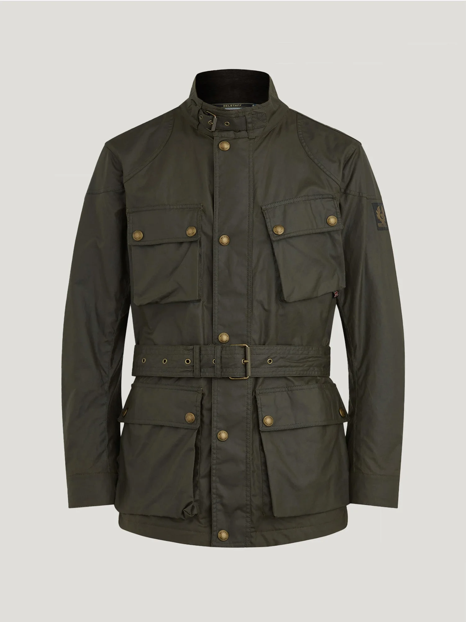 Our definitive jacket since 1948, the Trialmaster's roots are in the Scottish Six Days Trial, originally developed to keep riders dry in tough weather conditions. Built to last from our Faded Olive 6 oz. waxed cotton, it features a legacy slanted map pocket and adjustable belt so you can perfect the fit. Re-wax to keep it water and wind-repellent. Snaps into the Icon Gilet (sold separately). DETAILS - 6 oz. waxed cotton, with a unique blend of micro and technical waxes - Water-repellent and wind-repellent - Cotton twill lining woven in the signature Belstaff checked pattern - Corduroy linings at the collar, cuffs and hem provide added comfort and resilience at high contact points - Belstaff phoenix patch on left sleeve - Centre front zip and snap placket - Buckle-adjusted collar - Four modern, storm proof bellows pockets with dual press stud closure - Signature tilted left chest pocket - By choosing our cotton products, youare supporting Belstaff`s investment in Better Cottonas mission. This product is sourced via a system of mass balance and therefore may not contain Better Cotton. Learn more at bettercotton.org/learnmore - Shell: 100% Cotton, Body Lining: 100% Cotton - Sleeve Lining: 55% Polyester, 45% Viscose/Rayon - Product ref: 105310FDOLI SIZE AND FIT - Cut for a regular fit - Model wears a size US 40 - Model measures: Height: 6'3", Chest: 37", Waist: 32"