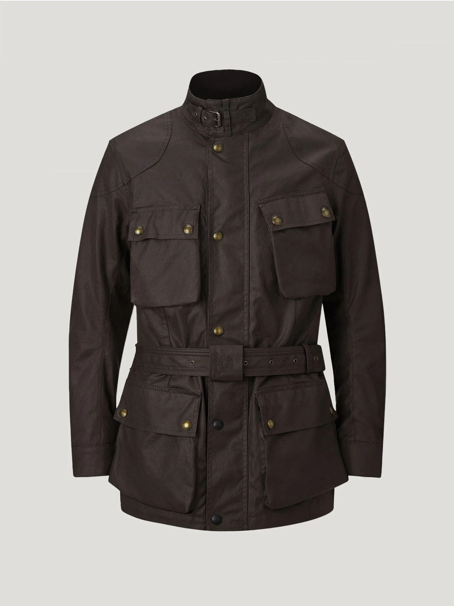 With its roots in the famous Scottish Six Days Trial, the Trialmaster has been our definitive jacket since 1948. This iteration has been updated with British Millerain 8oz, ultracore waxed cotton in Mahogany and a new sleeve cut for enhanced freedom of movement. D3O shoulder and elbow armour keep you protected on the road, and signature details like the slanted map pocket and archival check lining retain its iconic look, whilst the interlayered waterproof membrane and hand-waxed finish keep out the rain. DETAILS - 8oz. British Millerain Ultracore waxed cotton - Compatible with snap-in climate vest - Breathable, waterproof membrane - High tenacity nylon reinforcement at shoulder and elbow - Signature woven logo patch on left arm - Belstaff checked woven cotton lining - Oil resistant corduroy neck and cuffs - Knurled throat latch fastening buckle and strap - Swivel sleeve for 360Ë motion and comfort - Under arm metal airvents - Twin needle top stitching for strength - Internal zip pocket - Engraved antique brass hardware - Buckle cover with embroidered logo - Back pocket - 52% cotton, 48% polyester - Certification: AA - Protection: D3O Tri-ventilation level 1 (Elbow/Shoulder) - Product ref: 104691MAHOG SIZE AND FIT - Cut for a regular fit - Model wears a size L - Model measures: Height: 6'1", Chest: 40", Waist: 31"
