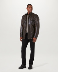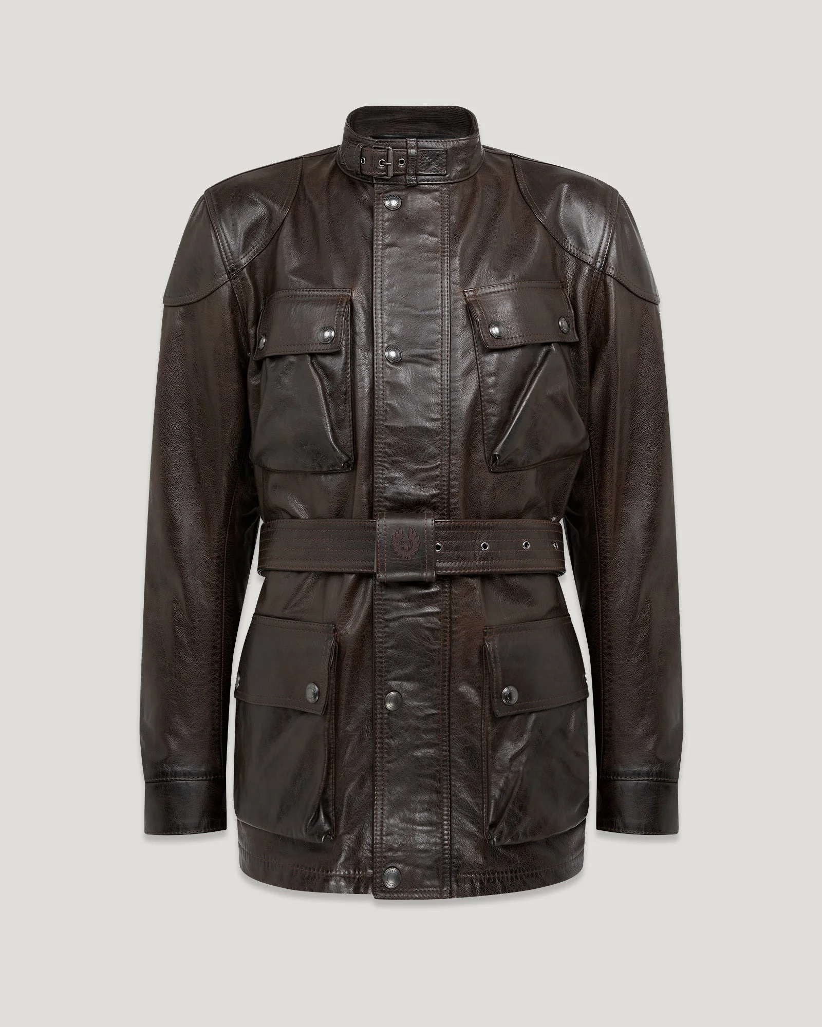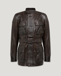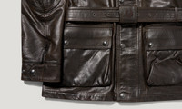 Crafted from 100 per cent cow leather, an 18-hour hand-waxing process provides the colour and ensures each jacket has a unique patina. Additional protection is provided by the oil resistant corduroy neck and cuff facings plus protective reinforcement beneath elbow and shoulder patches. Twin needle stitching ensures durability, and D3O shoulder and elbow armour offer protection. With swivel sleeves and underarm air vents for unrivalled mobility and comfort, the timeless Trialmaster styling is completed in Blackbrown with Belstaff checked woven cotton lining. DETAILS - Hand waxed leather (1-1.1mm thick) four pocket, longer, belted - Hand waxed to provide the colour - Unique patina to each jacket - Protective reinforcement beneath elbow and shoulder patches - Belstaff checked woven cotton liningA - Oil resistant corduroy neck and cuff facingsA - Knurled throat latch fastening buckle and strapA - Swivel sleeve for 360E motion and comfortA - Under-arm metal airventsA - Twin needle top stitching for strengthA - 15cm inside zip pocket for valuablesA - Engraved stud and buckle fastenings - Buckle cover with embroidered logoA - Back protection pocket - Metal patch logo on left arm - 100% Cow leather - Certification: A - Protection: D3O Tri-ventilation level 1 (Elbow/Shoulder) - Product ref: 105377BKBRN SIZE AND FIT - Cut for a regular fit - Model wears a size L - Model Measures: Height: 6'2", Chest: 39", Waist: 32"