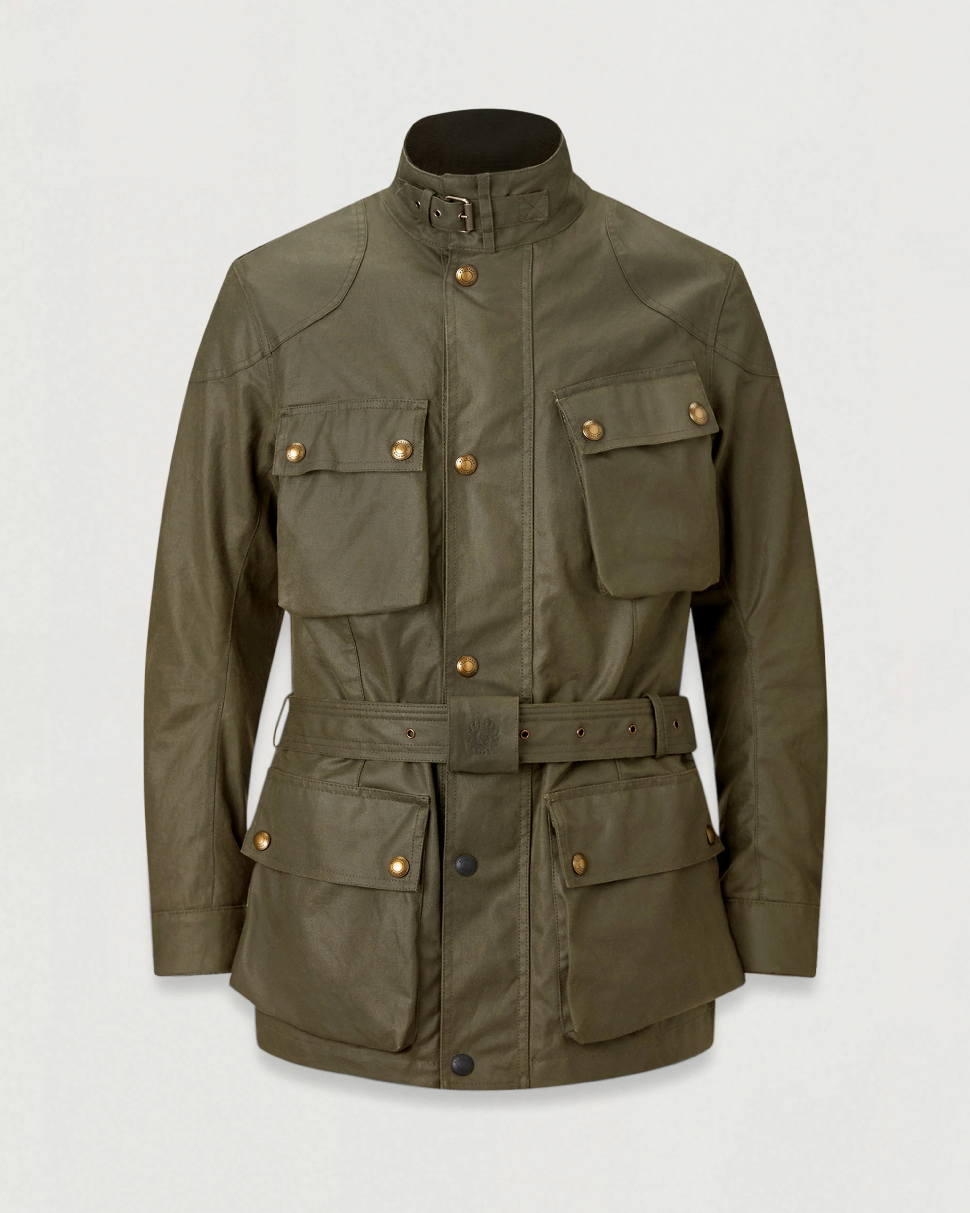 With its roots in the famous Scottish Six Days Trial, the Trialmaster has been our definitive jacket since 1948. This iteration has been updated with British Millerain 8oz, ultracore waxed cotton in Olive Green and a new sleeve cut for enhanced freedom of movement. D3O shoulder and elbow armour keep you protected on the road, and signature details like the slanted map pocket and archival check lining retain its iconic look, whilst the interlayered waterproof membrane and hand-waxed finish keep out the rain. DETAILS - 8oz. British Millerain Ultracore waxed cotton - Compatible with snap-in climate vest - Breathable, waterproof membrane - High tenacity nylon reinforcement at shoulder and elbow - Signature woven logo patch on left arm - Belstaff checked woven cotton lining - Oil resistant corduroy neck and cuffs - Knurled throat latch fastening buckle and strap - Swivel sleeve for 360Ë motion and comfort - Under arm metal airvents - Twin needle top stitching for strength - Internal zip pocket - Engraved antique brass hardware - Buckle cover with embroidered logo - Back pocket - 52% cotton, 48% polyester - Certification: AA - Protection: D3O Tri-ventilation level 1 (Elbow/Shoulder) - Product ref: 104691OLIGR SIZE AND FIT - Cut for a regular fit - Model wears a size L - Model measures: Height: 6'1", Chest: 40", Waist: 31"