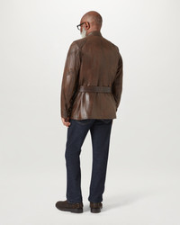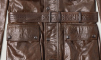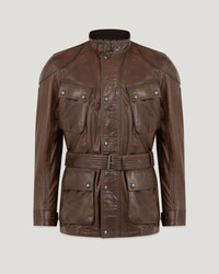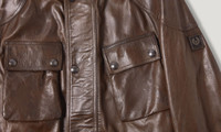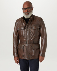 The premium leather counterpart to our iconic waxed cotton classic style, our Trialmaster Panther in Dark Earth is a definitive Belstaff jacket. The distinctive details endure, from the slanted map pocket to the adjustable buckled collar and belt. Our artisanal hand finishing gives the leather a unique patina and adds a water-repellent property. The patina will darken and become richer with time and wear. DETAILS - Hand waxed leather with a patina that will darken with age - Classic Belstaff shape - Buckle waist belt - Metal plaque on leather base on left sleeve - Centre front zip fastening - Snap button placket - Buckle strap at collar - Press studs at cuffs - Four modern, stormproof bellows pockets with dual press stud closure - Belstaff's leather products support responsible manufacturing via the Leather Working Group - Shell: 100% Cow leather, Body lining: 100% Cotton, Sleeve lining: 100% Viscose - Product ref: 105312DKERT SIZE AND FIT - Cut for a regular fit - Model wears a size 38 - Model measures: Height: 5'11", Chest: 42", Waist: 32"