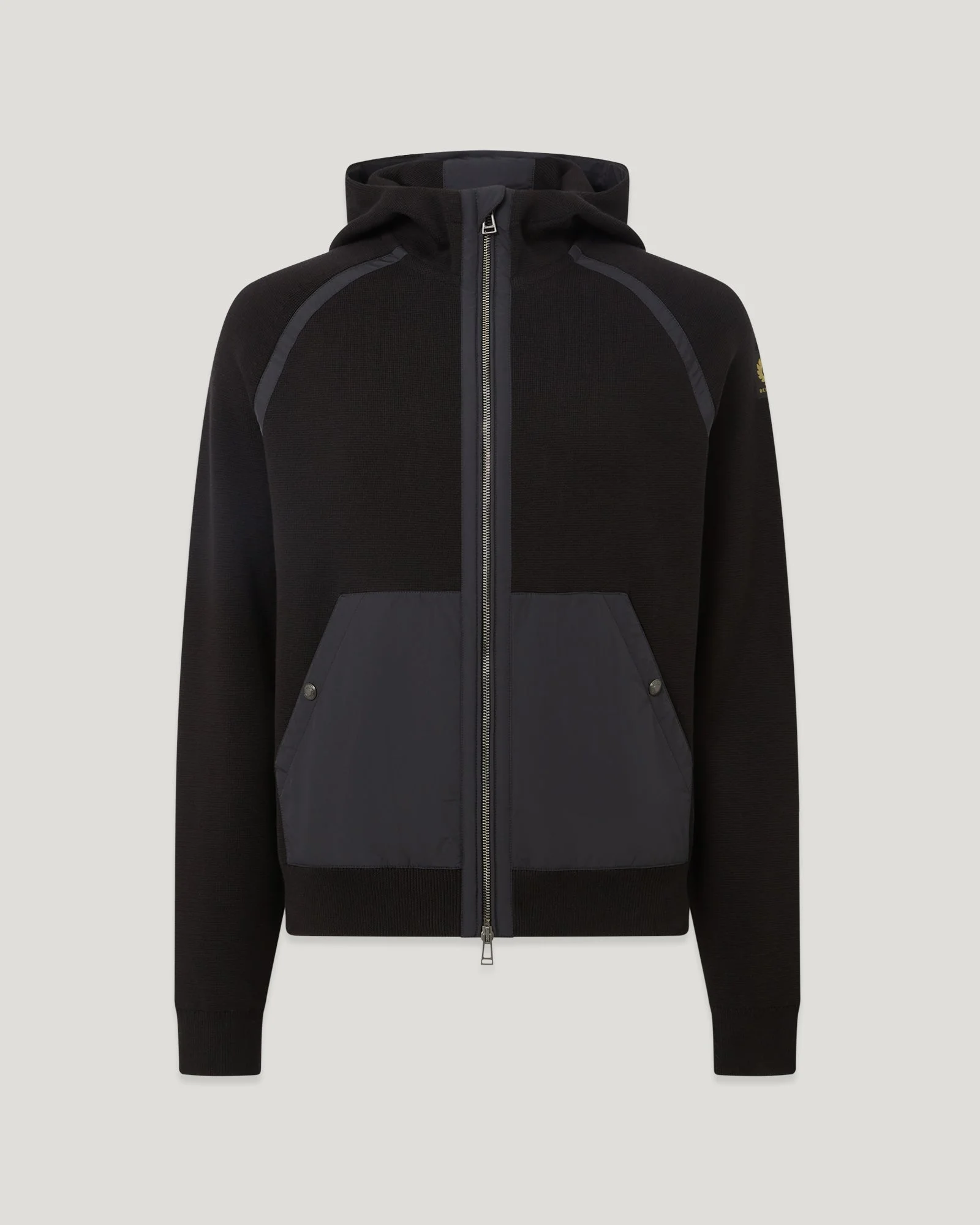 The View hooded full-zip sweater in black is an essential piece for your wardrobe this season. It is crafted from premium cotton with a Milano compact knit stitch – a double knit fabric that is soft yet structured for a shape-maintaining fit. DETAILS - Centre front two-way zip - Snaps on pockets - Main material: 100% cotton - Woven: 100% polyester - Filling: 100% recycled polyester - Made in Turkey - Dyed in Turkey - Product ref: 106136BLACK SIZE AND FIT - Cut for a regular fit - Model wears a size L - Model measures: Height: 6.0", Chest: 42.5", Waist: 34"