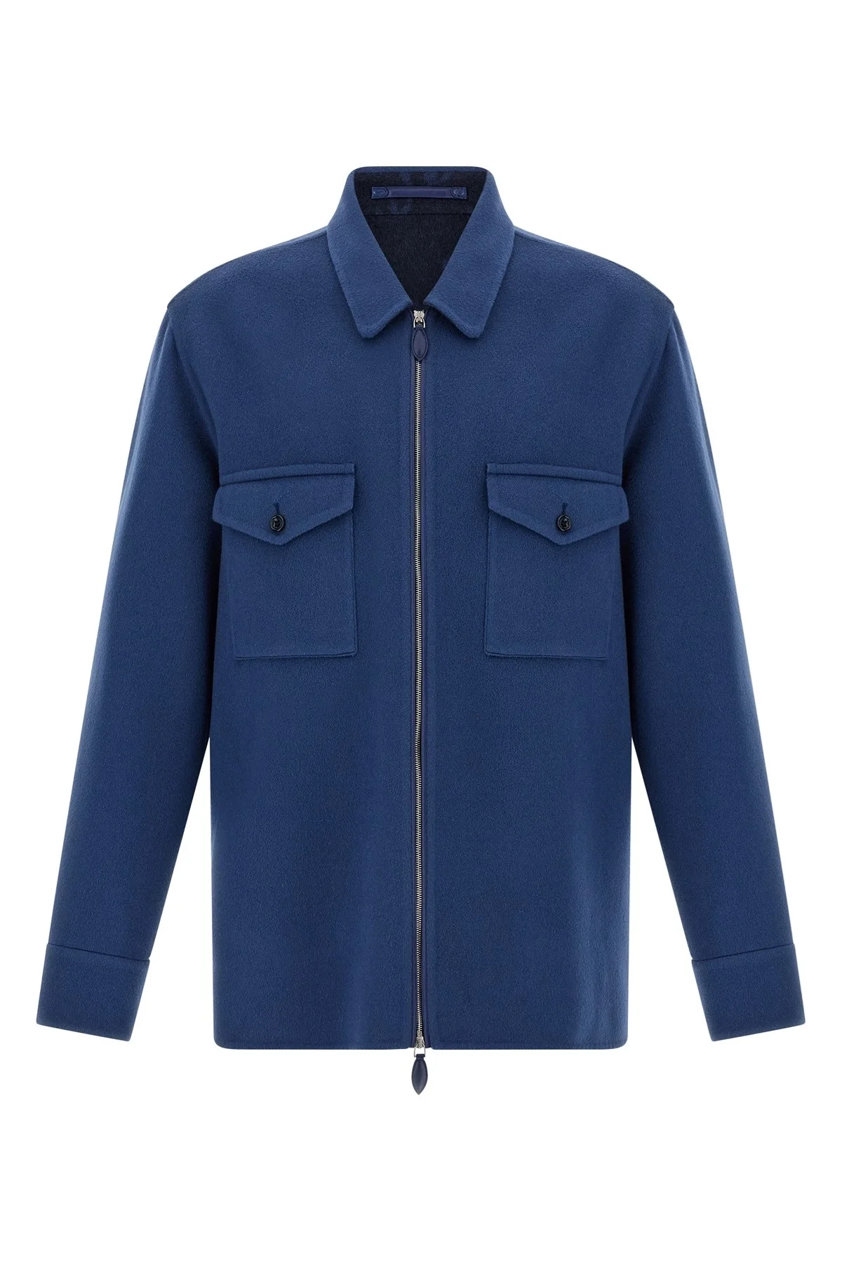 cod. R29HCL10300131F Overshirt in double wool and cashmere cloth, front zip closure, pockets, long sleeves with cuffs, unlined. Color: Blue Size & Fit: true to size fit - COLLAR size Composition: 70% wool 30% cachemire Made in: Italy