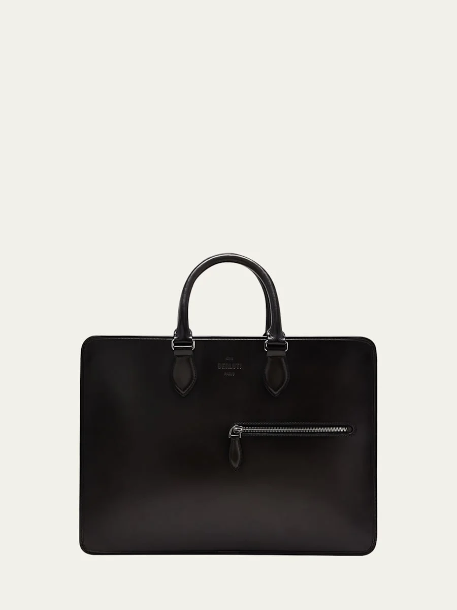 Berluti briefcase in Venezia leather Two rolled top carry handles One detachable adjustable shoulder strap Twoway zip closure Two main zip compartments Exterior, one zip pocket, one trolley strap Interior, one zip pocket, one laptop compartment, one slip pocket Debossed logo at front Cotton/linen lining Wipe with soft cloth Approx. 12"H x 16.5"W x 4"D Made in Italy