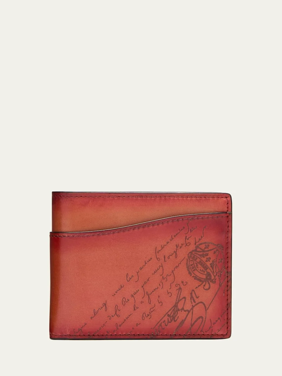 Berluti "Makore" slim bifold wallet in calf leather with signature Scritto from the Jour line Exterior, one slip pocket Interior, eight card slots, two slip pockets, one note compartment Leather lining Approx. 3.74"H x 4.33"W Made in Netherlands