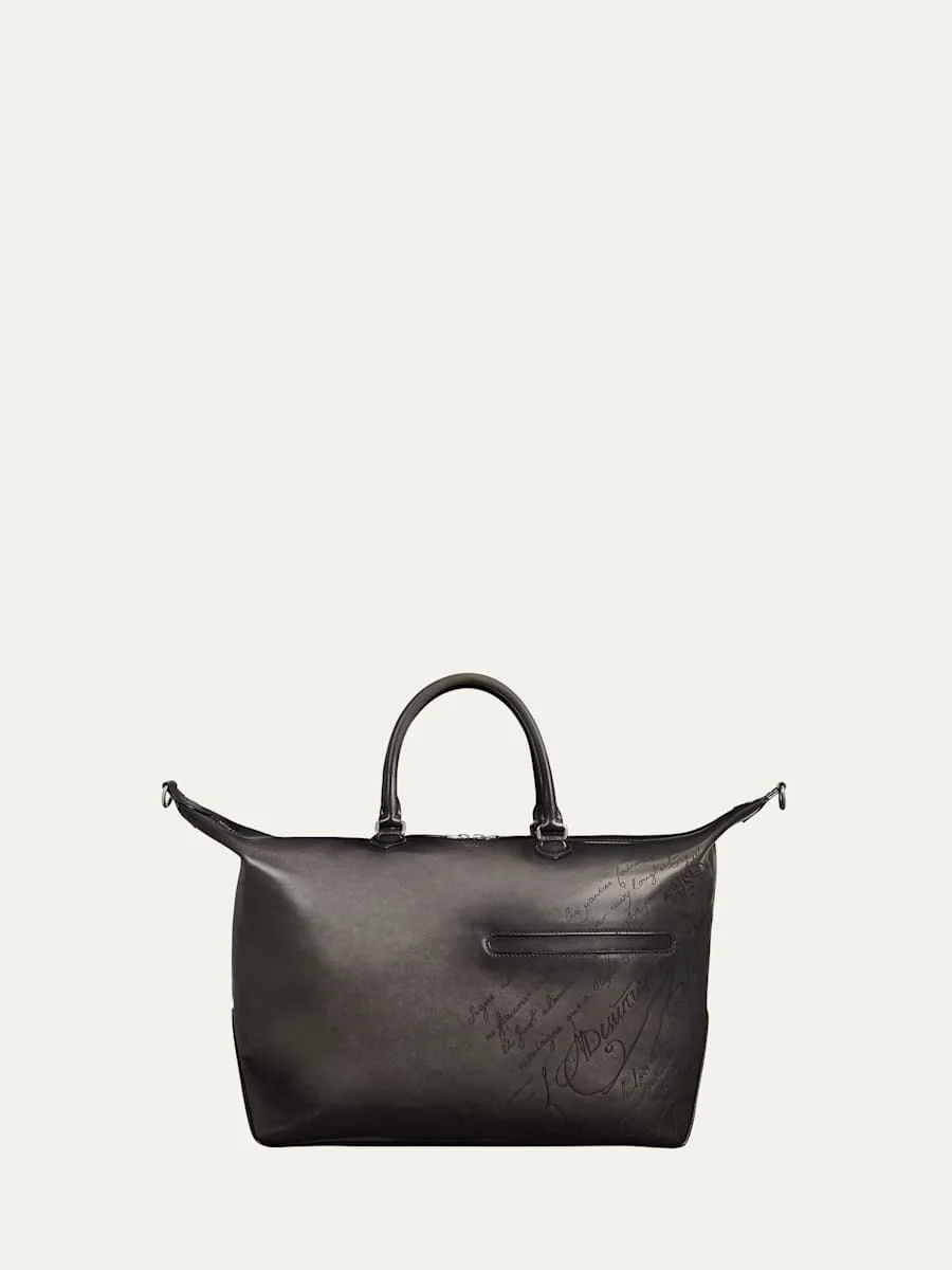 Berluti "Toujours" soft travel bag in scritto leather Two rolled top handles One detachable adjustable shoulder strap Two-way zip closure Exterior, one slip pocket, one trolley strap Interior, one zip pocket Debossed logo at front Cotton/linen lining Approx. 14.9"W x 6.4"H x 7.9"D Wipe clean with soft cloth Made in Italy Proposition 65 warning for California residents Online Inquiries: BGS21_NCRTJ| Store Inquiries: #4938360