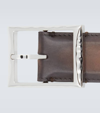 Featuring the label's Scritto motif, this brown leather belt from Berluti has a flip buckle, that can be reversed on the black burnish side. Product Details - Material: calf leather - Lining: calf leather - Made in Italy - Designer color name: Nero + Tobacco Bis - Closure: buckle fastening - Includes: dust bag - Item number: P00481352 Size & Fit - Width 3,5cm-1.5"