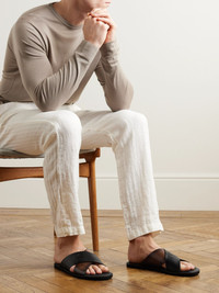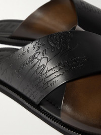 Berluti's 'Sifnos' sandals are crafted from its signature Venezia leather - the unique brown and black patina has been meticulously applied by hand and will continue to evolve as you wear them. They're debossed with the brand's 'Scritto' motif and set on lightweight rubber soles. Size & Fit - Fits true to size. Take your normal size - Only available in full sizes, go up to the nearest whole size if you take a half size - UK sizing Details & Care - Black and tonal-brown Venezia leather (Calf) - Designer colour: Cacao Intenso