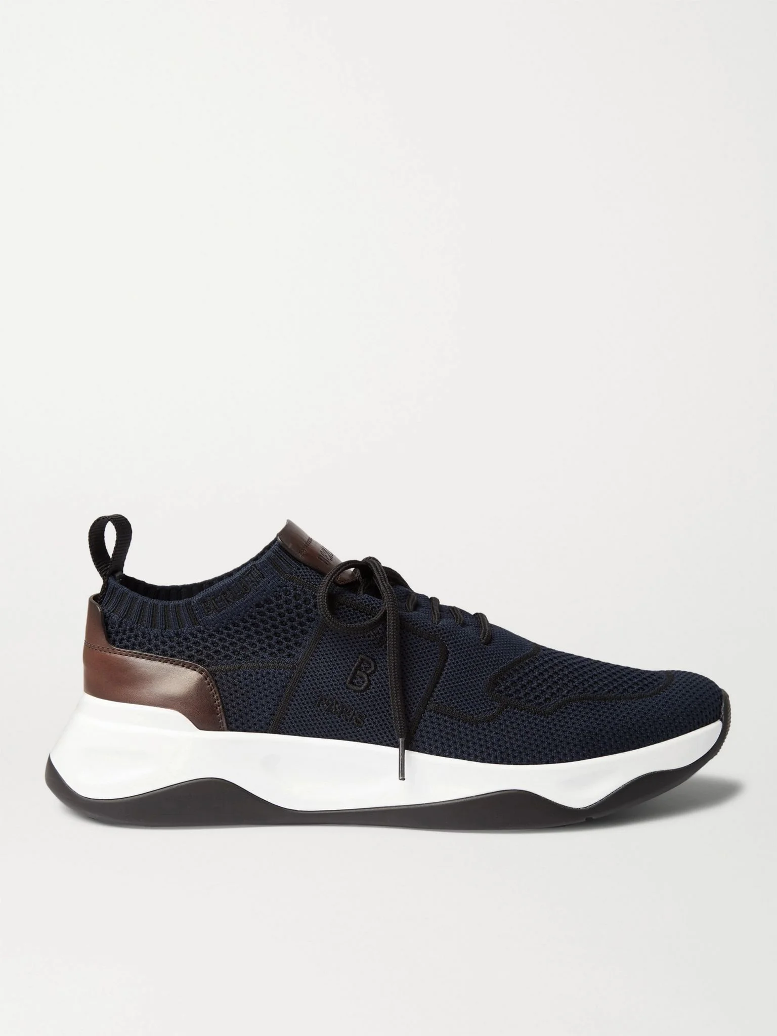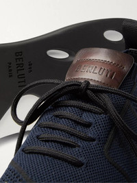 Berluti puts the same quality of craftsmanship into sneakers as it does dress shoes. Nodding to its legacy in leatherwork, this 'Shadow' pair is panelled with Venezia hide that's patinaed in-house by artisans. They're made from soft and breathable stretch-knit, and set on lightweight rubber soles. Wear them with: [Prada Trousers id1251821], [TOM FORD T-shirt id915537], [The Row Jacket id1113743], [Breitling Watch id1137649]. Size & Fit - Fits true to size. Take your normal size - UK sizing Details & Care - Navy and black stretch-knit, brown Venezia leather (Calf) - Pull tabs, embroidered designer emblems, rubber soles - Lace-up - Come with dust bag - Style number: S4918-001