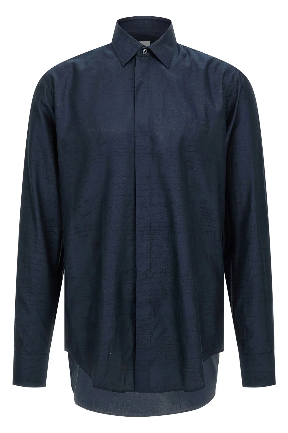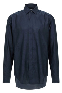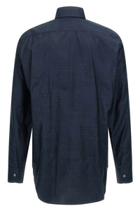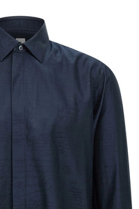 cod. R29HTL85001N40 Mulberry silk and cotton blend shirt with all-over jacquard 'Scritto' pattern, tone-on-tone embroidered logo, concealed front button closure, long cuffed sleeves. Color: Blue Size & Fit: true to size fit - COLLAR size Composition: 53% silk, 47% cotton Made in: Italy