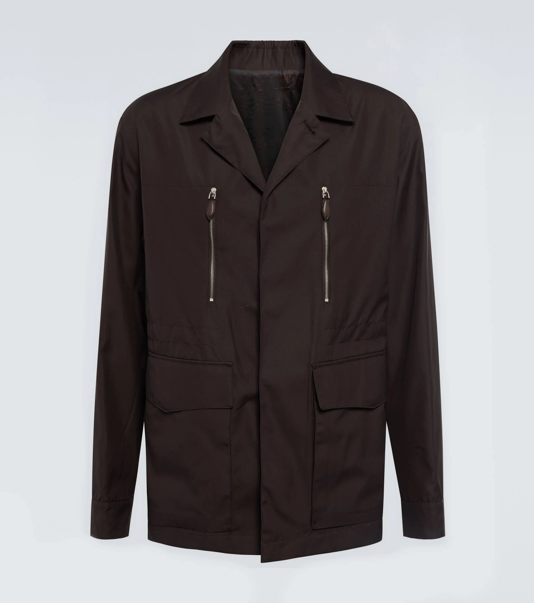 Build your transitional-season wardrobe with this jacket from Berluti. The design is made from a silk blend and has patch pockets. Product Details - Pocket lining: 35% cotton, 65% polyester - Made in Italy - Material: 93% mulberry silk, 7% polyurethane - Designer color name: Brown - Pockets: buttoned pockets, zipped pockets - Closure: buttoned front - Care instructions: dry clean - Item number: P00735471 Size & Fit - True to size - Designed for a loose fit - Mid-weight material - Falls to the hip - The model in the picture is 185cm-6'1" and wearing a size IT 48
