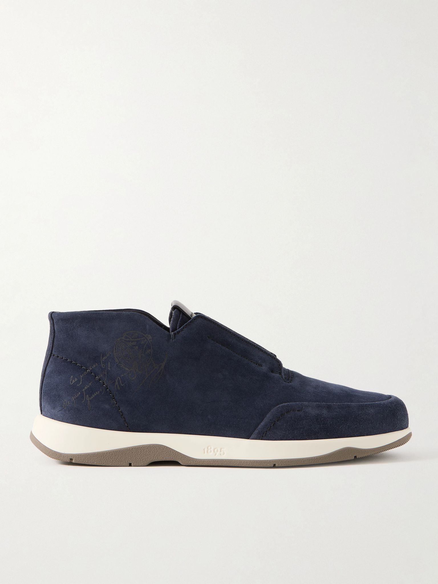 These 'Echappee' sneakers feature Berluti's signature 'Scritto' detailing, which is taken from an excerpt of an 18th-century letter. They've been made in Italy from suede and have a convenient slip-on design. The two-tone rubber soles are etched with the brand's founding year. Size & Fit - Fits true to size. Take your normal size - UK sizing Details & Care - Navy suede, black leather (Calf) - Style number: S6272-001