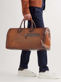 Berluti's duffle bag is crafted from the brand’s signature Venezia leather, unique for its smooth, glossy finish and dappled tone, and is etched with a recognisable ‘Scritto’ motif inspired by an 18th century letter bought at auction by the founder. The generously sized proportions make it a sensible choice for travel. Attach the shoulder strap to carry heavy loads more comfortably. Size & Fit - Handle Length: 16cm / 6.3in - Height: 28cm / 11in - Width: 57cm / 22.4in Details & Care - Brown Venezia leather (Calf) - Two top handles, detachable shoulder strap - Debossed designer emblems, front zipped pocket - Zipped pocket, two slip pockets - Two-way zip fastening - Comes with dust bag