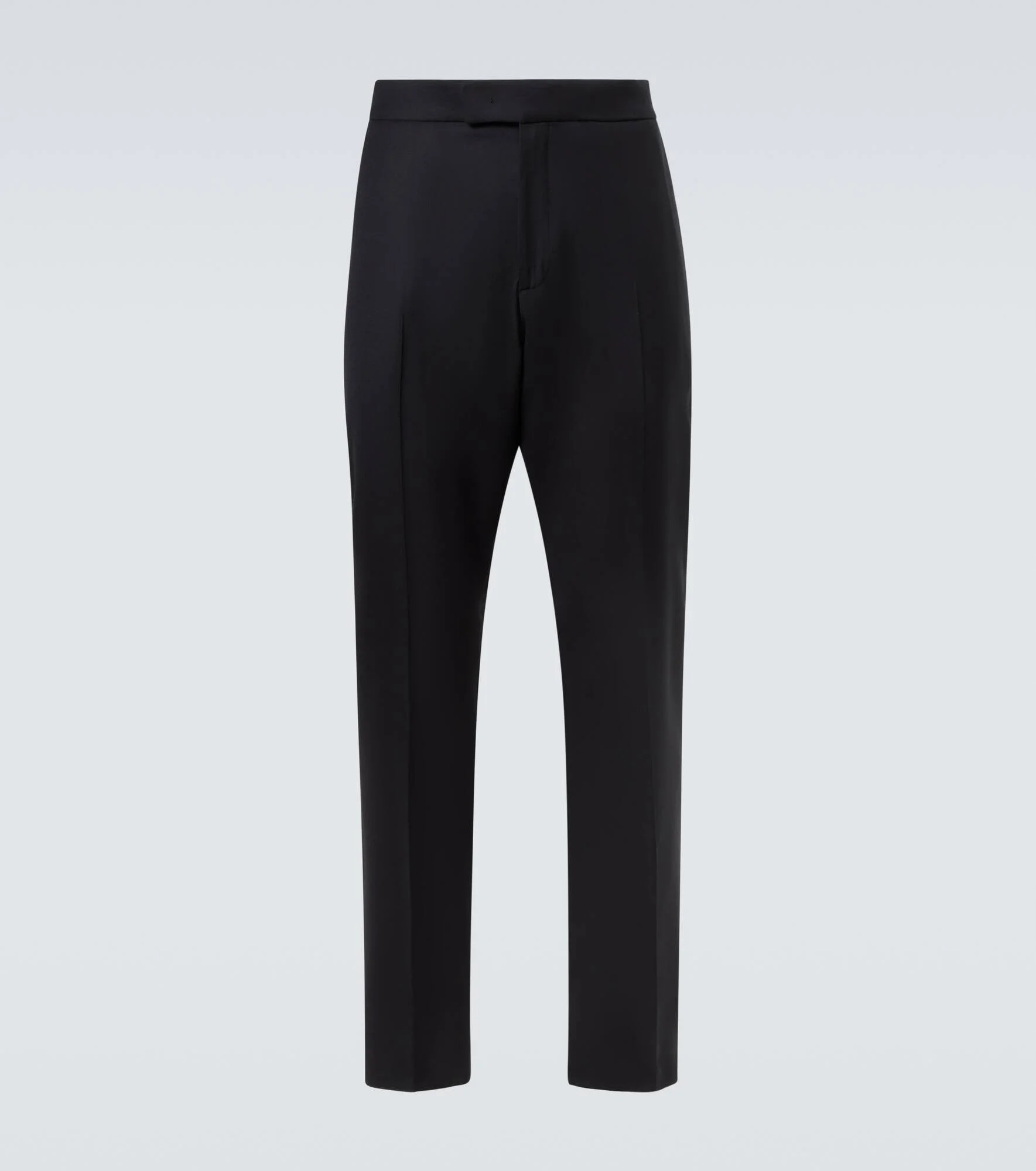 Look polished in the boardroom and beyond with these pants from Berluti. The design is crafted from wool and boasts a comfortable mid-rise waist. Product Details - Material: 99% wool, 1% polyamide - Care instructions: dry clean - Made in Italy - Designer color name: Black/Night Blue - Item color: black - Pocket lining: 65% polyester, 35% cotton - Details: 100% lamb leather - Hardware color: silver - Closure: zip and button fastening - Elasticated waistband - Pockets: zipped pockets, back pockets - Single pleat - Item number: P01067211 Size & Fit - True to size - Non-stretchy fabric - Straight leg - Unhemmed for tailoring - Height of model is 189cm-74.5" and wears a size 50