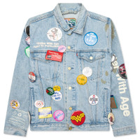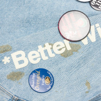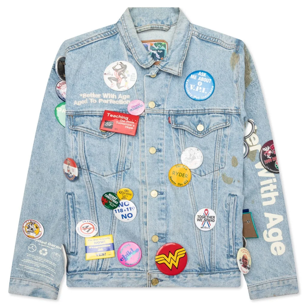 The Campaign Denim Jacket in Indigo is crafted from cotton and features a button-up closure with chest pockets. Adorned with an array of unique buttons and pins, each jacket is made from hand-picked, sourced vintage denim, ensuring no two pieces are alike. Buyers will also receive a one-of-a-kind, random colored pair of jeans, adding to the exclusivity of the purchase. Please note that product photos are examples, as every item is individually unique and will vary. THIS PRODUCT DOES NOT QUALIFY FOR DISCOUNTS OR SPECIAL PROMOTIONS, ALL SALES ARE FINAL. - 100% Cotton - Button up closure - All over buttons/pins - Chest pockets - Each item is unique. Individual products will vary - Style No: BWADJCAM-IND-3