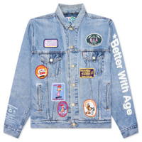 The Charlatan Reversible Denim/Baseball Jacket in Indigo is crafted from cotton and features a button-up closure with chest pockets. Adorned with an array of unique buttons and pins, each jacket is made from hand-picked, sourced vintage denim, ensuring no two pieces are alike. Buyers will also receive a one-of-a-kind, random colored pair of jeans, adding to the exclusivity of the purchase. Please note that product photos are examples, as every item is individually unique and will vary. THIS PRODUCT DOES NOT QUALIFY FOR DISCOUNTS OR SPECIAL PROMOTIONS, ALL SALES ARE FINAL. - 100% Cotton - Button up closure - All over buttons/pins - Chest pockets - Each item is unique. Individual products will vary - Style No: BWACJCHA-IND-2