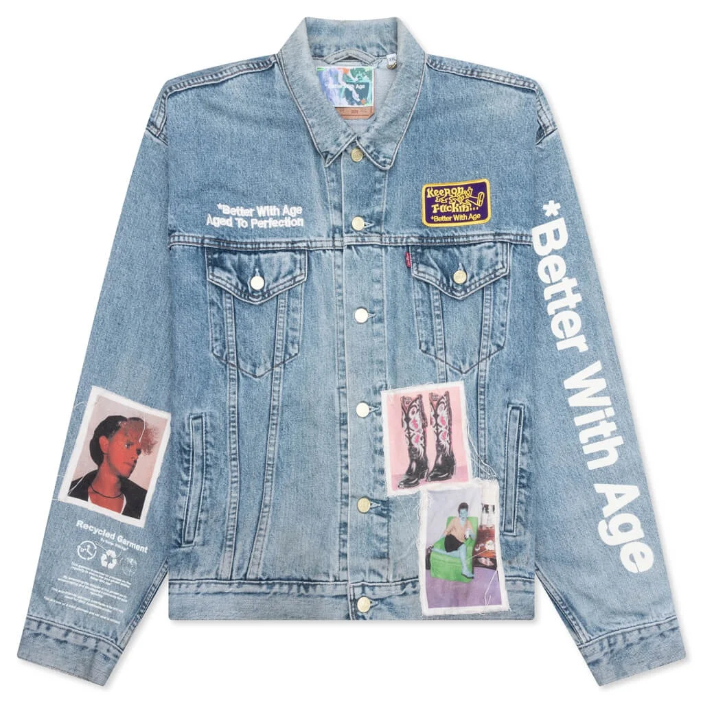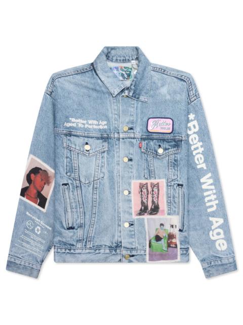 The Portrait Denim Jacket in Multi is crafted from cotton and features distressed detailing alongside bold brand embroidery. The jacket's standout patchwork and portrait design adds a creative, artistic touch. It has a classic button-up closure and is made from unique, hand-picked vintage denim by BWA. Due to the nature of the materials, each jacket is one-of-a-kind, with product photos serving as examples. Signs of age, such as stains, blemishes, or wear, may be present, reflecting the garment’s vintage origins. Additionally, each piece has been measured and resized to accommodate any size variances due to its vintage nature. THIS PRODUCT DOES NOT QUALIFY FOR DISCOUNTS OR SPECIAL PROMOTIONS, ALL SALES ARE FINAL. - 100% Cotton - Distressed detailing with brand embroidery - Patchwork and portrait design - Button-up closure - Unique sourced vintage denim, hand picked by BWA. - Product photos are used as an example of what the buyer may receive. - This garment may display stains, blemishes, wear, or general signs of age. - This garment has been measured and resized to account for size variance due to age. - Style No:BWADJPOR-MUL-11