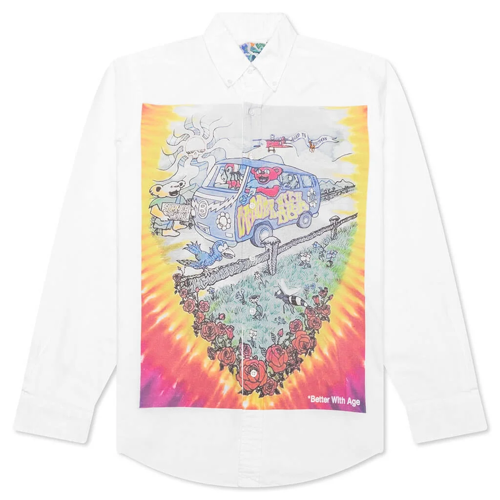 The Better With Age Road Trip Button-Down Shirt is crafted from heavy cotton and features printed graphics on the front and back. Each piece is carefully sourced from vintage collections ensuring that no two pieces are alike. The shirt is designed with a curved hem, standard collar, and buttoned cuffs. This garment may display stains, blemishes, wear, or general signs of age adding to its unique charm. BUYER WILL RECEIVE A ONE-OF-ONE VINTAGE SHIRT IN A RANDOMLY SELECTED COLOR. PRODUCT IMAGES SHOWN ARE EXAMPLES AND MAY NOT REFLECT THE EXACT ITEM RECEIVED. ALL SALES ARE FINAL. - Fabric type varies - Printed graphics - Standard collar - Button down closure - Curved hem - Buttoned cuffs - Patch tag - Style No: BWABDRT-WHT