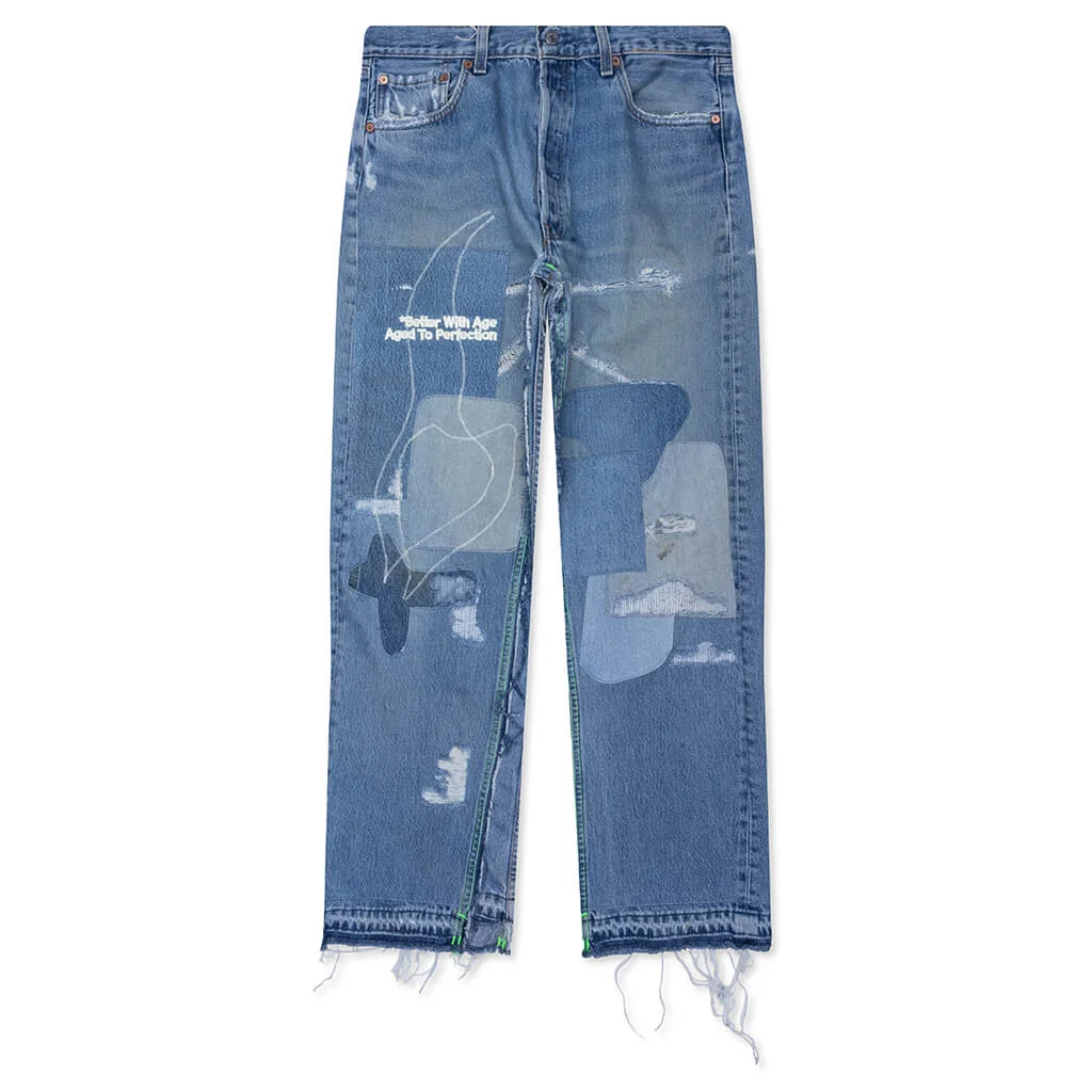 The Better With Age Sterling Repair Denim Trouser is a standout piece that embodies the brand's dedication to sustainability and individuality. Each piece is crafted from authentic vintage denim and uniquely reworked with repaired distressing, giving each piece a one-of-one feel. With embroidered brand tagline, exclusive trimming, and custom logo branding, this denim offers a perfect blend of elevated style and unique craftsmanship. This garment design varies and may display stains, blemishes, wear, or general signs of age, adding to its unique charm. BUYER WILL RECEIVE A ONE-OF-ONE VINTAGE DENIM IN A RANDOMLY SELECTED COLOR. PRODUCT IMAGES SHOWN ARE EXAMPLES AND MAY NOT REFLECT THE EXACT ITEM RECEIVED. ALL SALES ARE FINAL. - Fabric type varies - One-of-one design - Embroidered brand tagline - Exclusive trimming - Custom logo branding - Button up or zip fly - Distressing and repair details - Hand stitching, beadwork, pin ornament, patchwork, embroidery, dyed, or printed graphics - May show signs of wear, blemishes, or age - Style No: BWADTSTER-IND