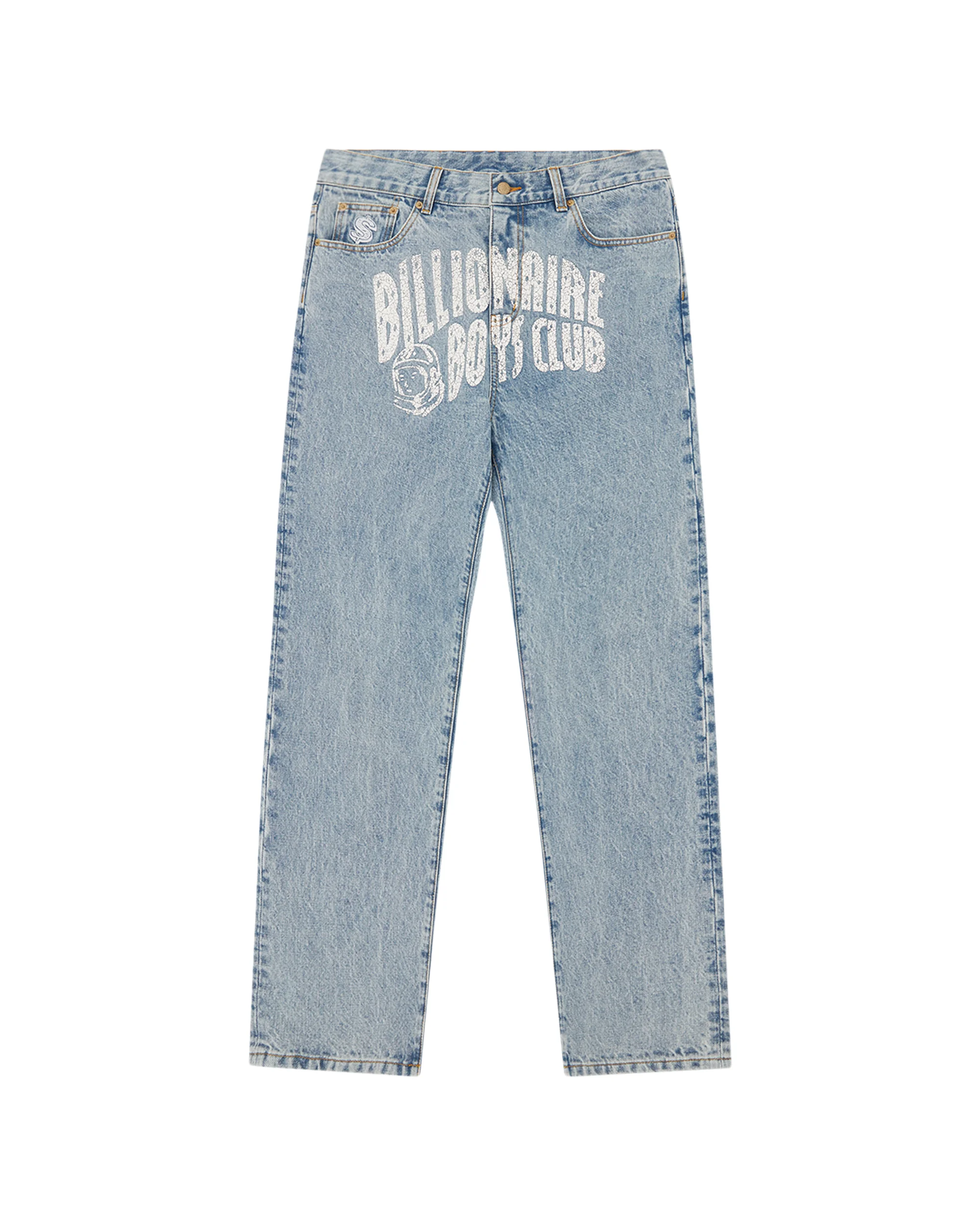 Arch Logo Denim Pant presenting the cracked ink Billionaire Boys Club logo on the front and the embroidered Astro helmet on both the back pockets. It is detailed with the dollar signet at coin pocket. - Light Wash Blue - Regular Fit - Cracked print Billionaire Boys Club Arch logo on the front - Embroidered Astro helmet on back pockets - Embroidered dollar signet at coin pocket - Zip-fastened - Branded button - Branded leather label - 100% Cotton