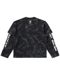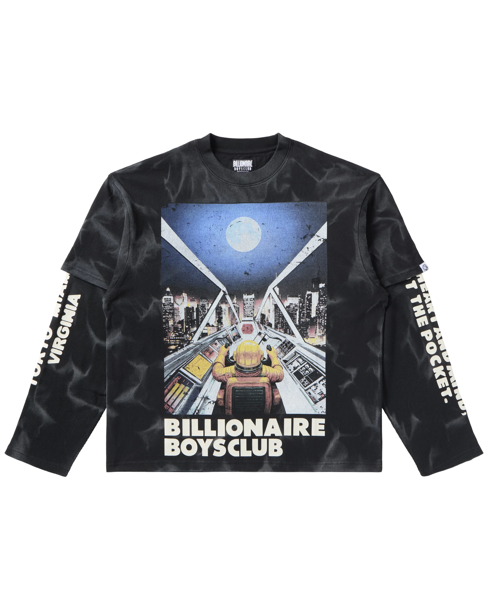 The Arrival Longsleeve Tee features a bold astronaut graphic on a black tie-dye base with a cosmic aesthetic. Sleeves feature global city names and the iconic "Wealth is of the heart and mind, not the pocket." manta, completed with a small astronaut logo on the back neck. - Black - Screen-printed graphic on the front and back - 100% Cotton