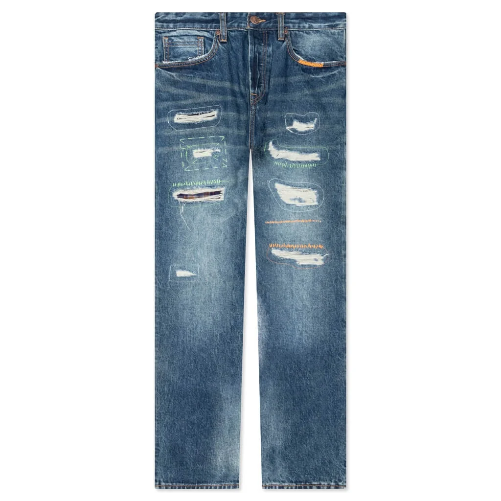 Add a new denim offering into your rotation with the Billionaire Boys Club Blaze Jean. Composed of cotton denim, the silhouette spotlights distressing paired with a 3D wrinkle effect. Repaired holes as well as embroidered back pockets offer a dimensional aesthetic. The five-pocket design is finished with a zip and button fly for a finished look. - 100% cotton denim - Reinforced belt loops - 3D wrinkle effect - Repaired holes - Embroidered imagery - Style No: 821-8101-FTA