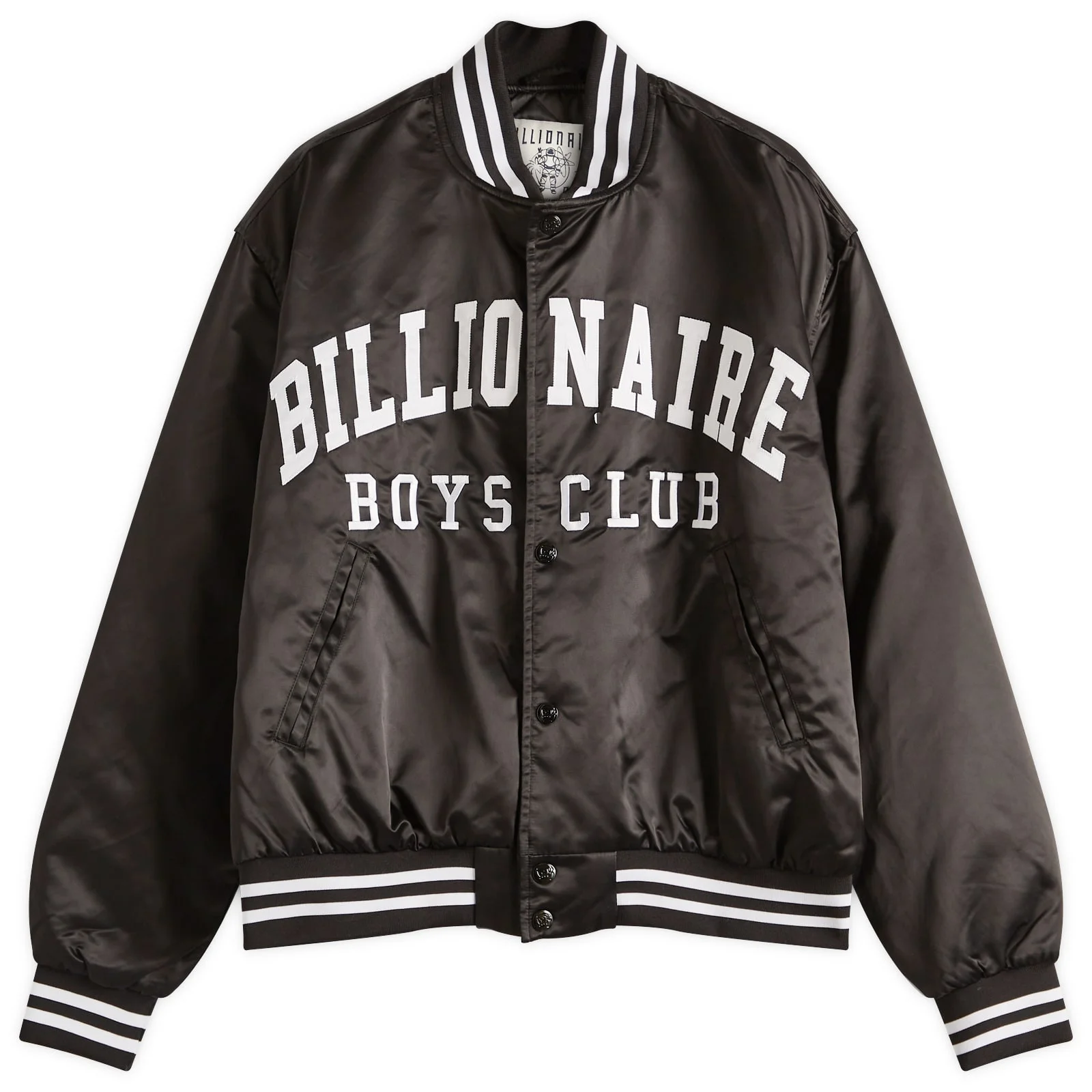 Varsity style is a well-referenced source of inspiration by Pharell’s Billionaire Boys Club, exhibited here on this College Bomber. Made from glossy satin fabric, it’s complete with logo lettering and sporty striped trims. - 100% Nylon - Rib Knit Collar - Embroidered Branding - Snap Button Closure