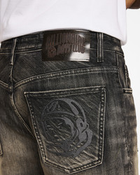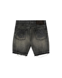 These jean shorts feature a raw edge hem, a distressed vintage wash, and detailed embroidered Helmet Heads on the back pocket. - Crater Black - Raw edge hem - Vintage wash - Helmet Head embroidery on the back pockets - 70% Cotton, 30% Polyester
