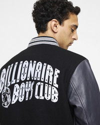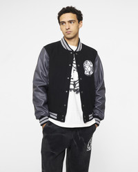 Constructed with genuine leather sleeves, this Varsity Jacket features welt pockets and intricate chenille embroidery. - Black - 60% Wool, 40% Polyester