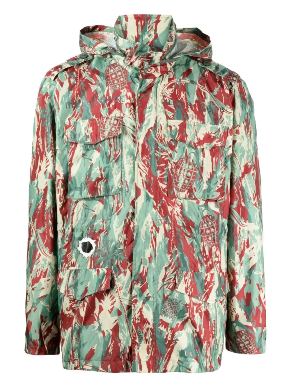 camouflage-print hooded jacket Highlights - Green and red - Camouflage print - Graphic print - Classic hood - Button fastening - Flap pockets - Long sleeves Imported Composition Polyester 100% Washing instructions Read Manufacturer Guidelines