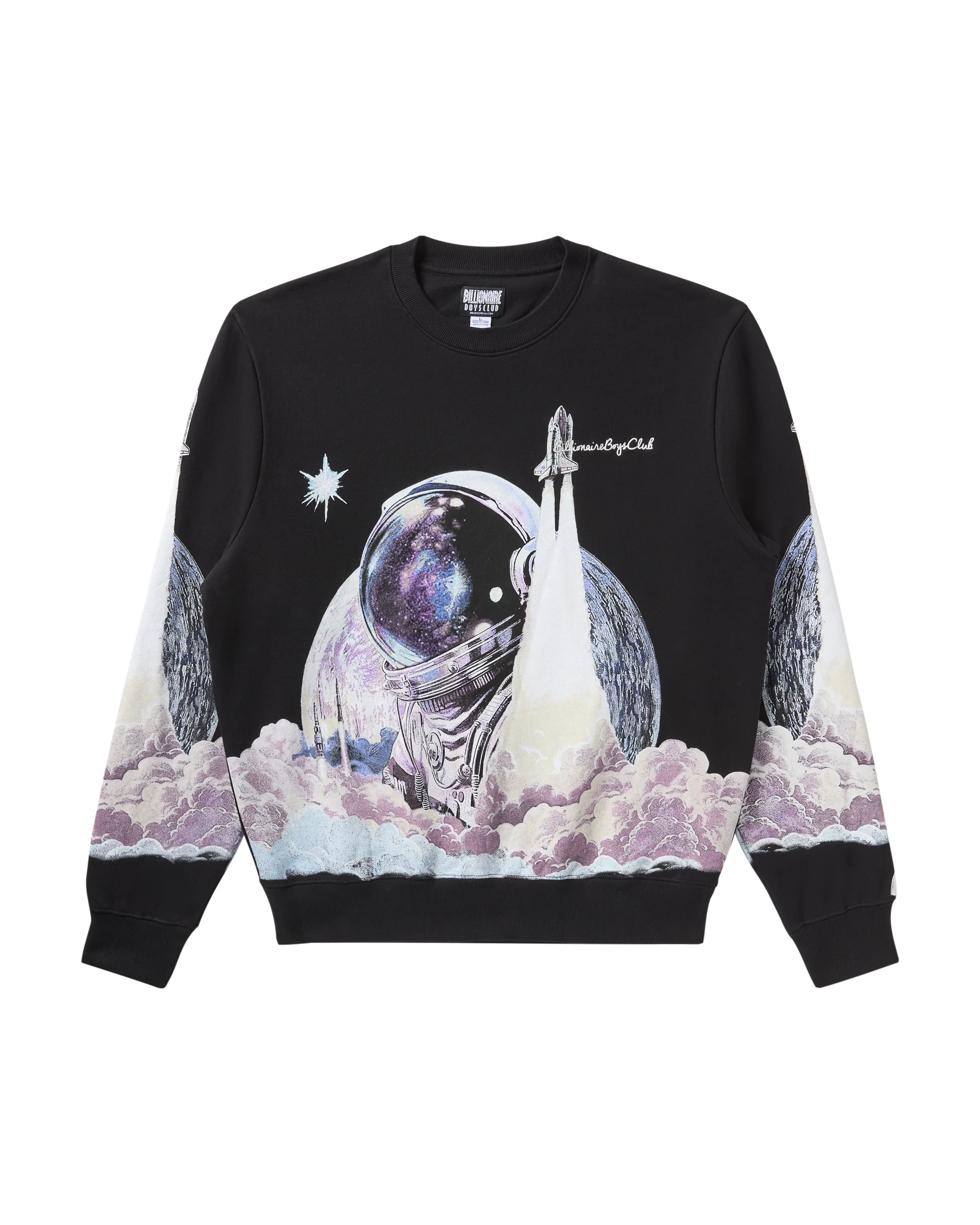 Cotton fleece crewneck showcasing a cosmic-inspired graphic with an astronaut helmet, rocket launch, and galaxy detailing, finished with sleeve artwork and back neck astronaut logo. - Black - Allover screen-printed astronaut and galaxy graphic - Rocket and space motifs at sleeves - Billionaire Boys Club script logo at chest - Ribbed cuffs and hem - Standing astronaut logo at back neck - 100% Cotton
