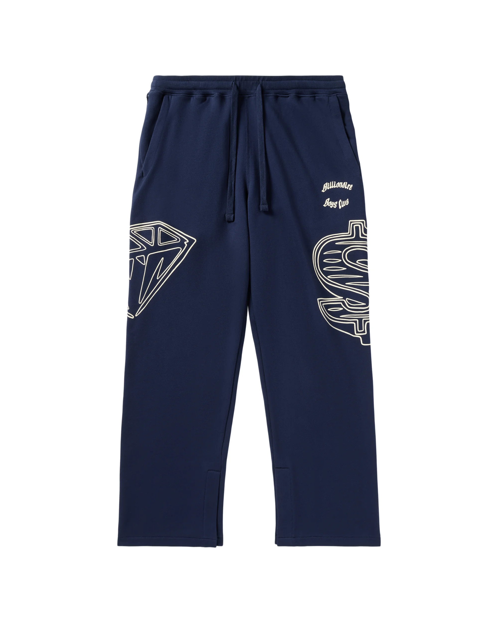 The Dual Sweatpants feature an adjustable waistband, a Billionaire Boys Club graphic on the left pocket, and the iconic Diamond & Dollar logo along the pant leg on both sides. - Navy Blazer - Adjustable waistband - Screen-printed graphics - 100% Cotton
