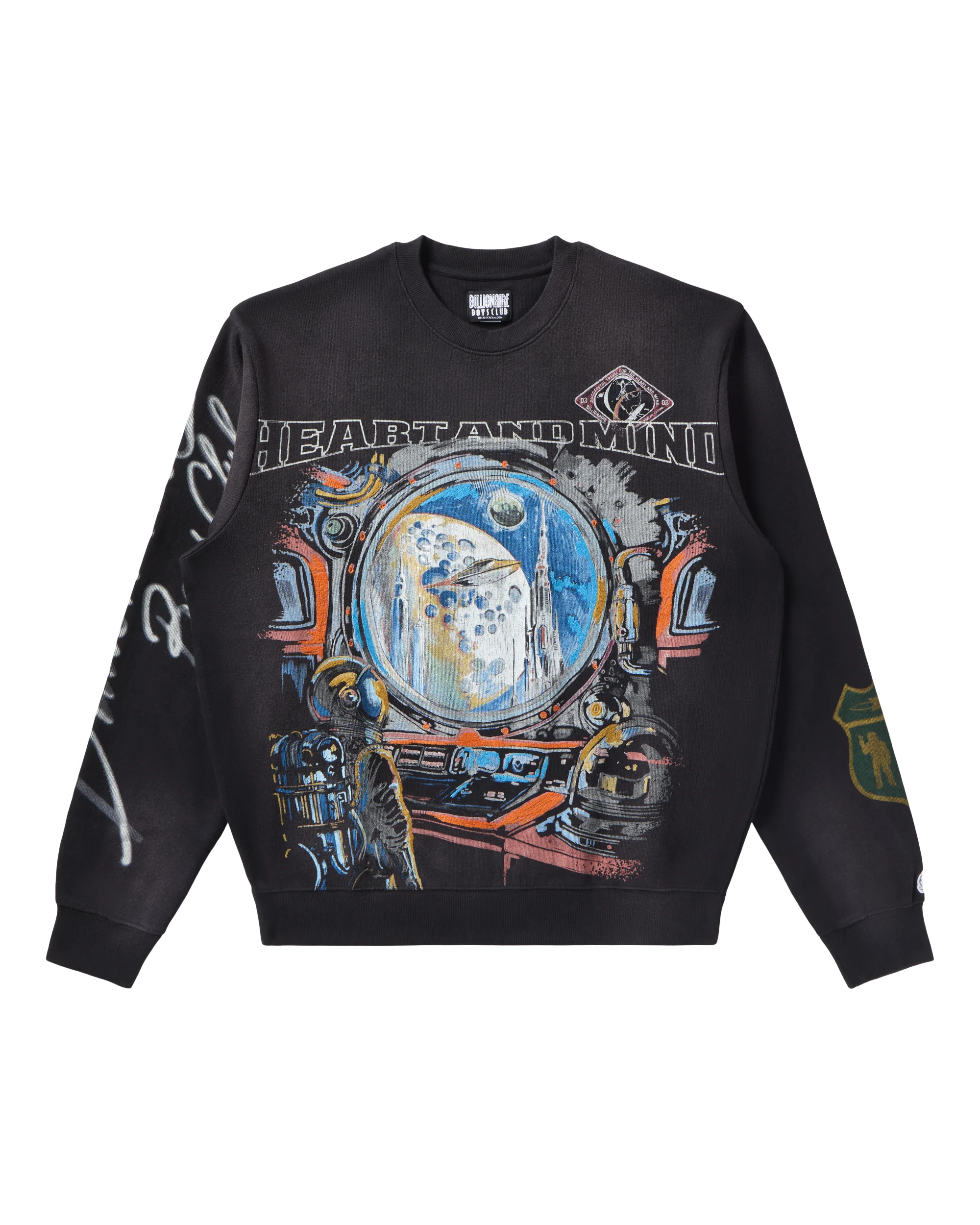 The Explore LS Knit features an astronaut's cockpit view with "HEART AND MIND" lettering on the front, while the back showcases vintage travel badges from BBC flagship cities. - Black - Screen-printed graphics on the front and back - 100% Cotton