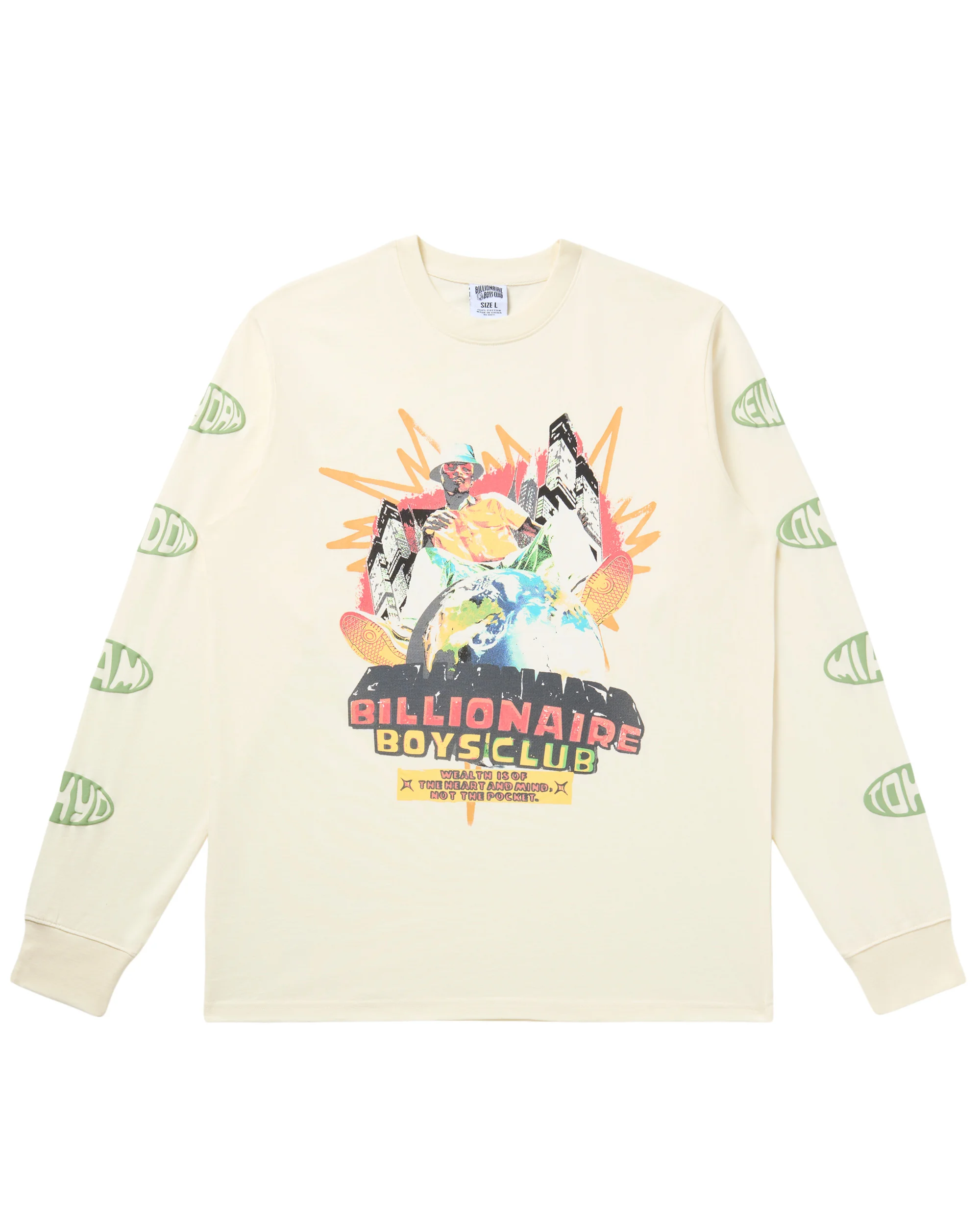 The Heart Mind Dance Long-sleeve Tee showcases a dance hall-themed design with the Billionaire Boys Club logo. It has various city names printed along the sleeves and the Standing Astronaut graphic on the back of the neck. - Winter White - Screen-printed graphics throughout - 100% Cotton