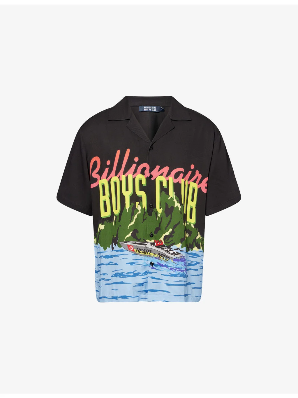 PRODUCT DETAILS - Billionaire Boys Club woven shirt - 100% viscose - Button fastening - Relaxed fit, camp collar, short sleeves, graphic print at front and back - Machine wash at 30°C - Made in Turkey - Model is 6ft 2in/1.88m and wears a size medium - Lightweight, non-stretch Ref: R04585582