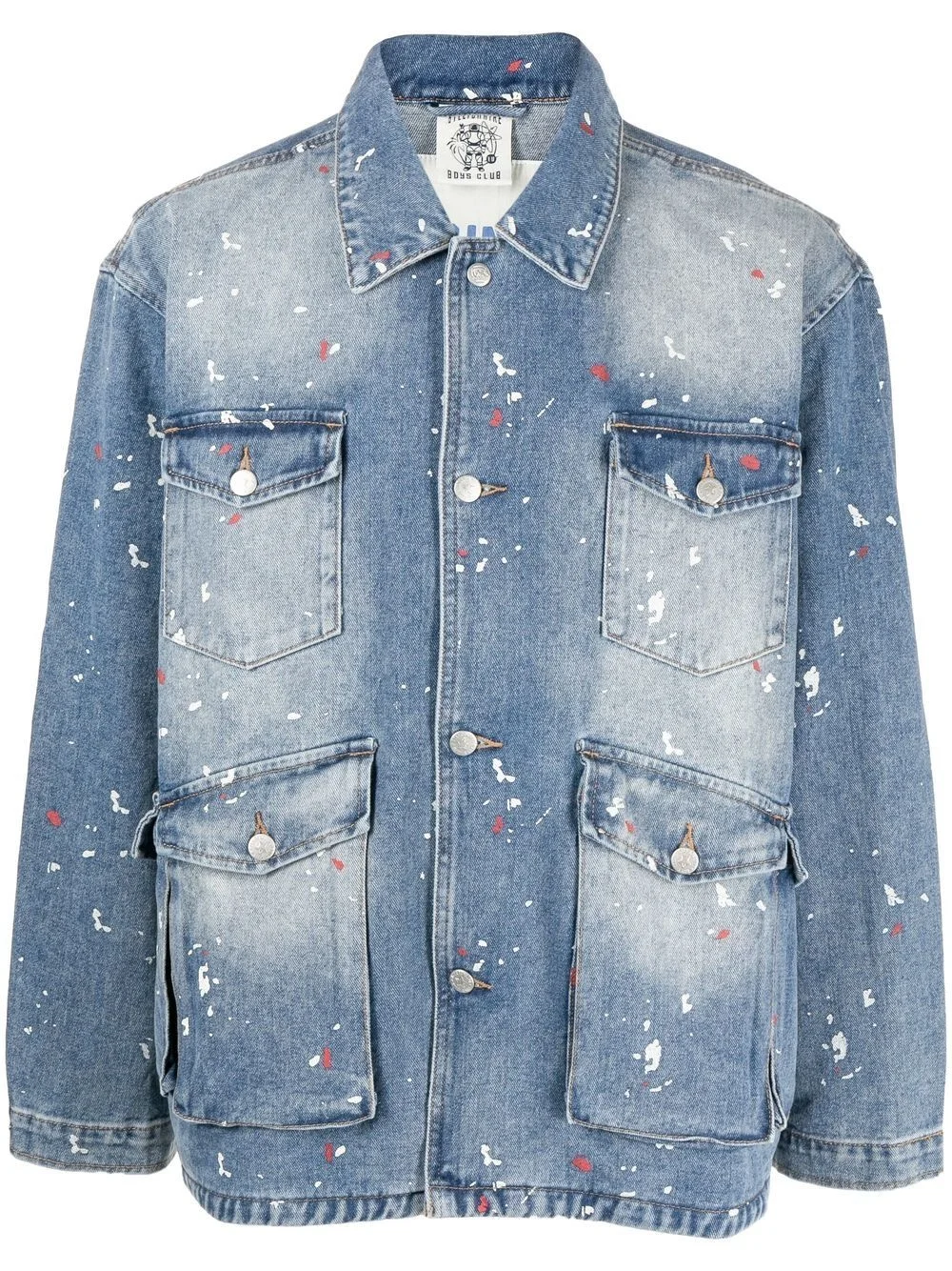 Jungle Fatigue denim jacket Issued in an authentic stonewash blue hue, this Billionaire Boys Club denim jacket is awash with an all-over splatter paint print. A chain-stitch Heart & Mind logo signs off to the rear. Imported Composition Outer: Cotton 100% SIZE & FIT Model measurements Height 6 ft 2 in(1.87 m) Bust/Chest 34.25 in(87 cm) Hips 36.22 in(92 cm) Waist 29.52 in(75 cm) FittingInformation This piece fits true to size. We recommend you get your regular size Cut for a loose fit Made with a mid-weight fabric