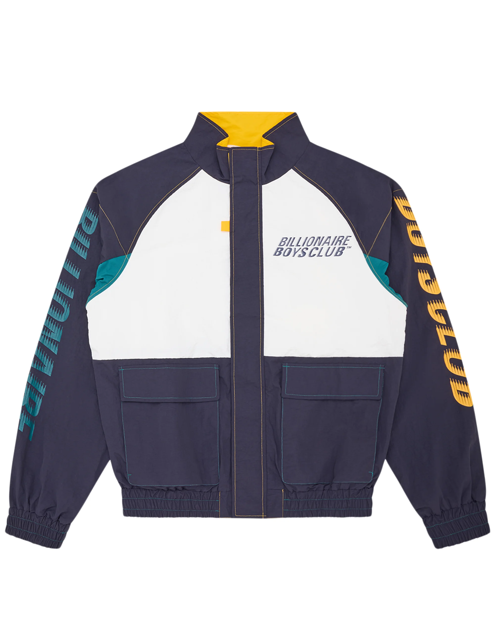 This Round The World Track Top features the Billionaire Boys Club round the world seasonal graphic on the chest and all over the back. It is detailed with the Billionaire Boys Club seasonal logo on both the sleeves and finished with contrasting yellow and blue stitching details. - Navy - Regular fit - Mesh lining - Contrasting yellow and blue stitching - Elasticated waistband and cuffs - Screen printed Billionaire Boys Club seasonal logo across both the sleeves - Screen printed Billionaire Boys Club round the world graphic on the chest and on the back - Branded zip concealed by a velcro closure - 100% Nylon
