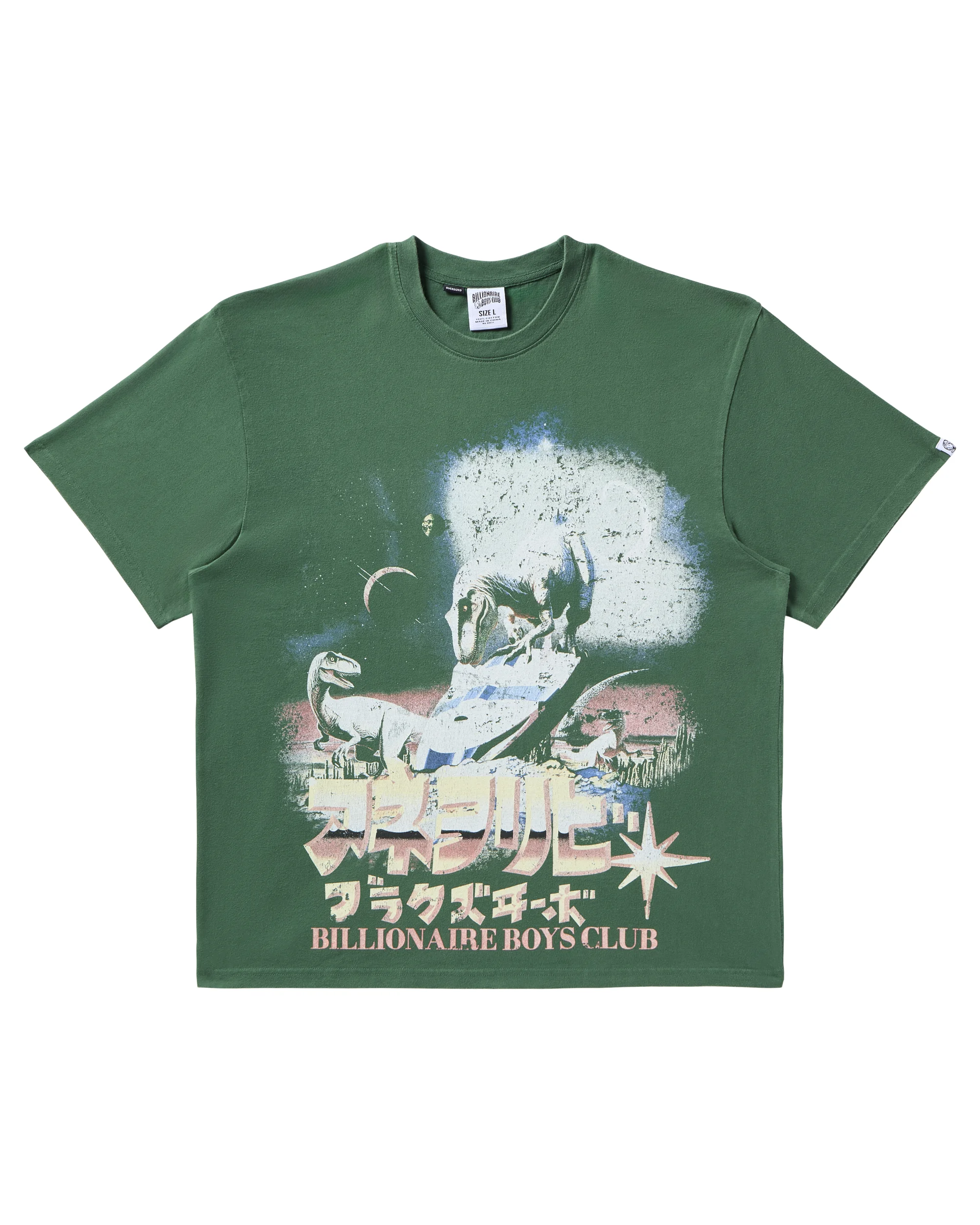 The Lost Tee features a vibrant, distressed-style graphic depicting dinosaurs, cosmic landscapes, and stylized Japanese text on the front and the Standing Astronaut logo on the back neck. - Eden - Oversized fit - Screen-printed graphic on the front and back - 100% Cotton