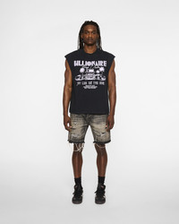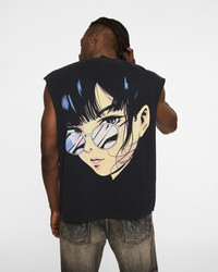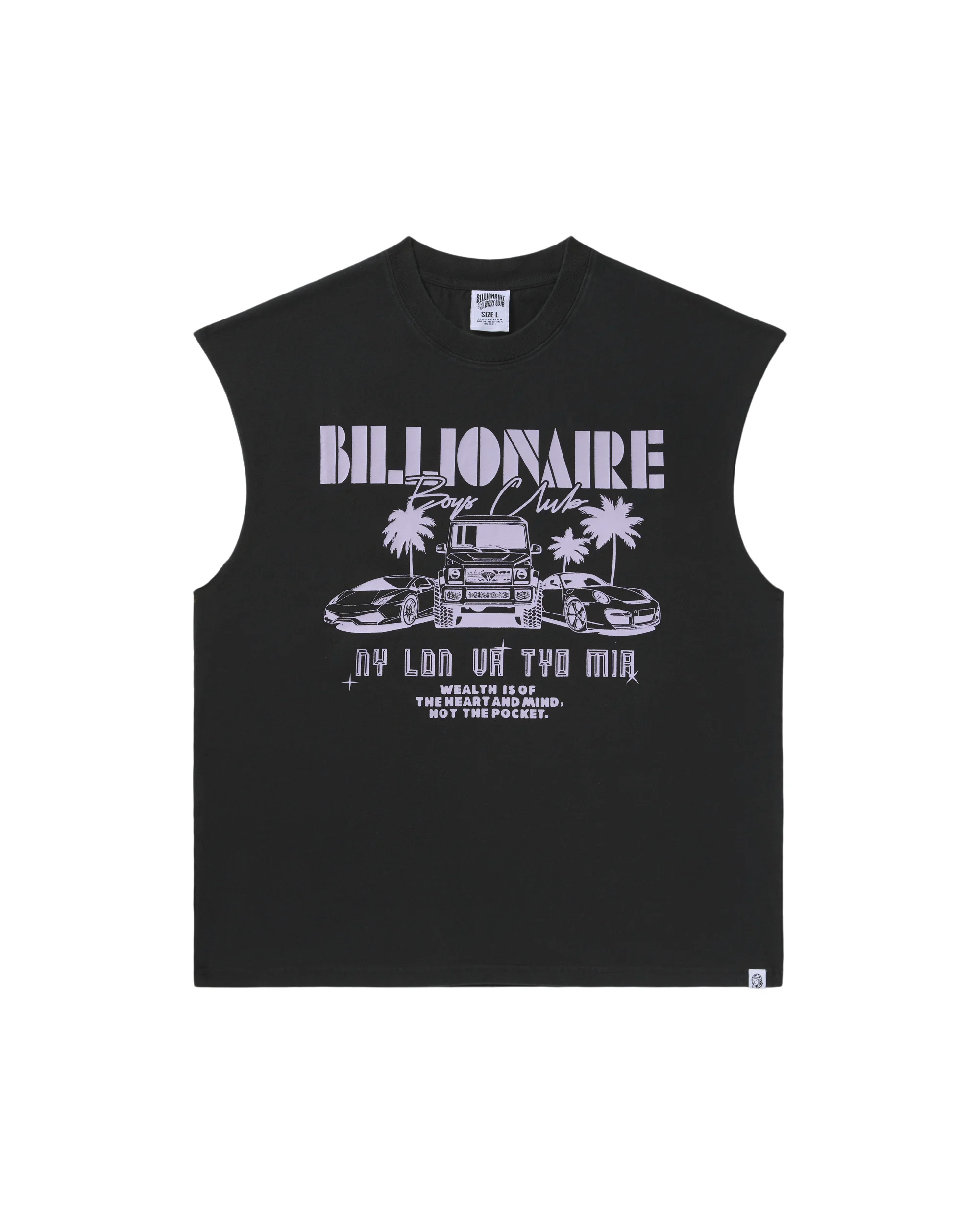 This tee showcases a front graphic of cars and palm trees paired with the mantra "wealth is of the heart and mind not the pocket," complemented by an anime-inspired design on the back. - Black - Sleeveless - Screen printed graphic on the front and back - 100% Cotton