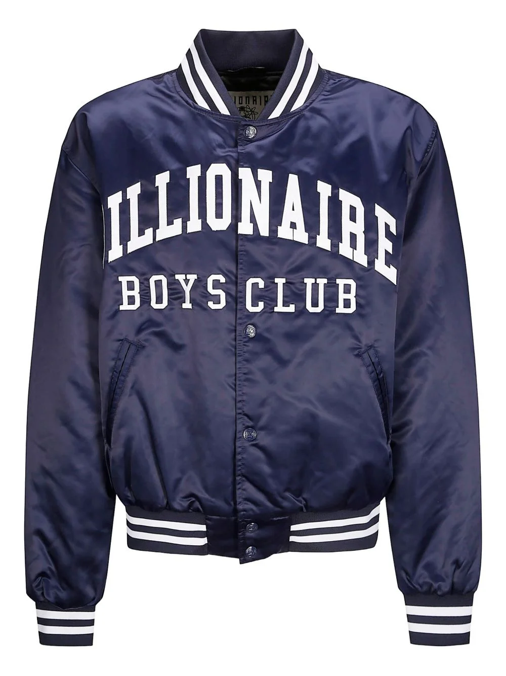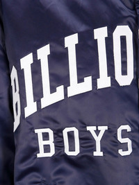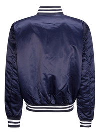 satin bomber jacket Highlights - Navy blue - Satin finish - Ribbed trim - Logo lettering - Press-stud fastening Imported Composition Polyester 100% Washing instructions Read Manufacturer Guidelines